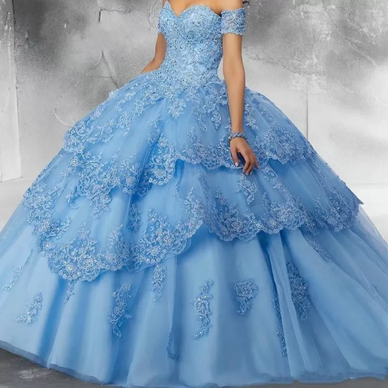 Съемный рукав светильник Небесно голубой Бальные платья 2021 платье принцессы бальное платье Милая Сладкий 15 Quinceanera платье с кружевной аппликацией и блестками