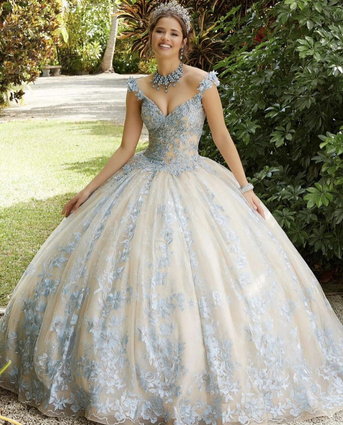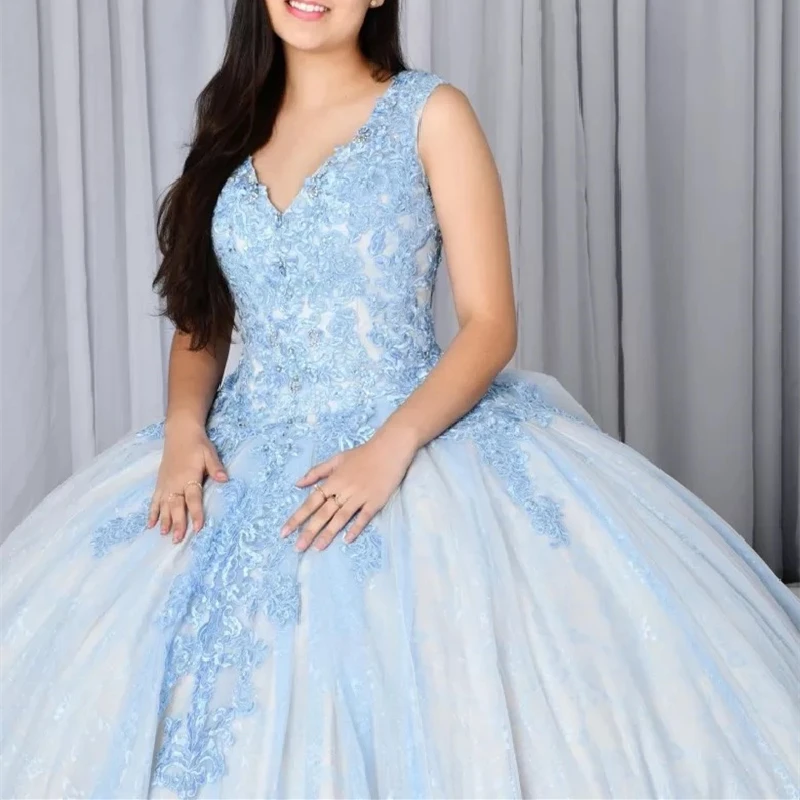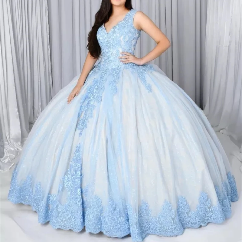 Пышное Бальное Платье с V-образным вырезом, платья для Quinceanera 2021, кружевное вечернее вечерние лое платье принцессы без рукавов с аппликацией и блестками для девочек 16