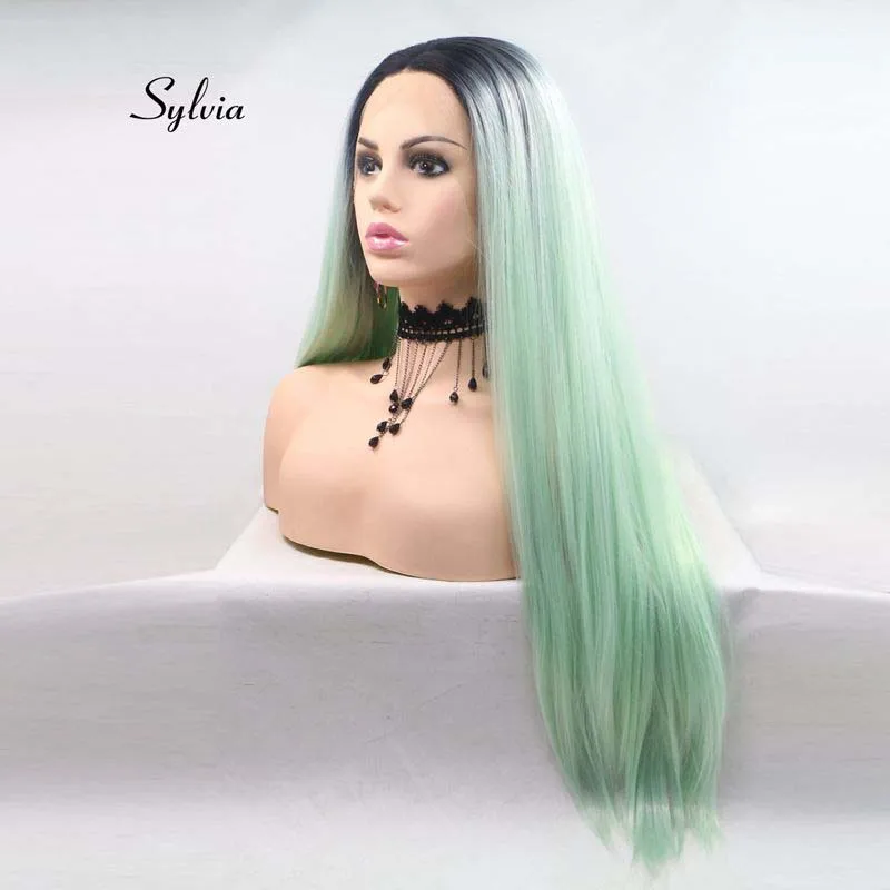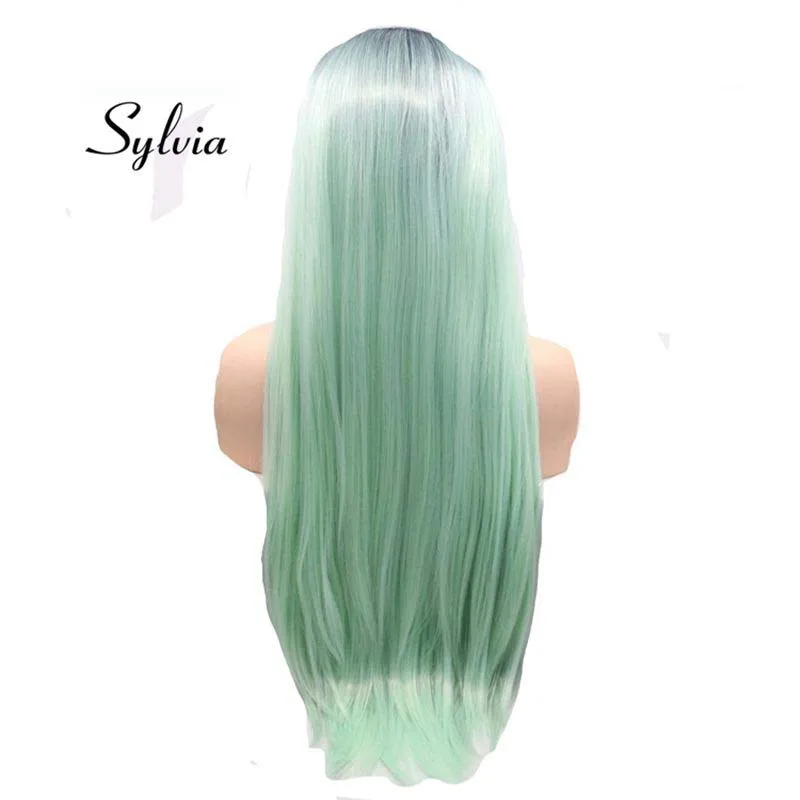 Серебристый мятно-зеленый двухцветный синтетический длинный парик с Омбре шелковистыми прямыми кружевами спереди с темными корнями из термостойкого волокна длинные волосы