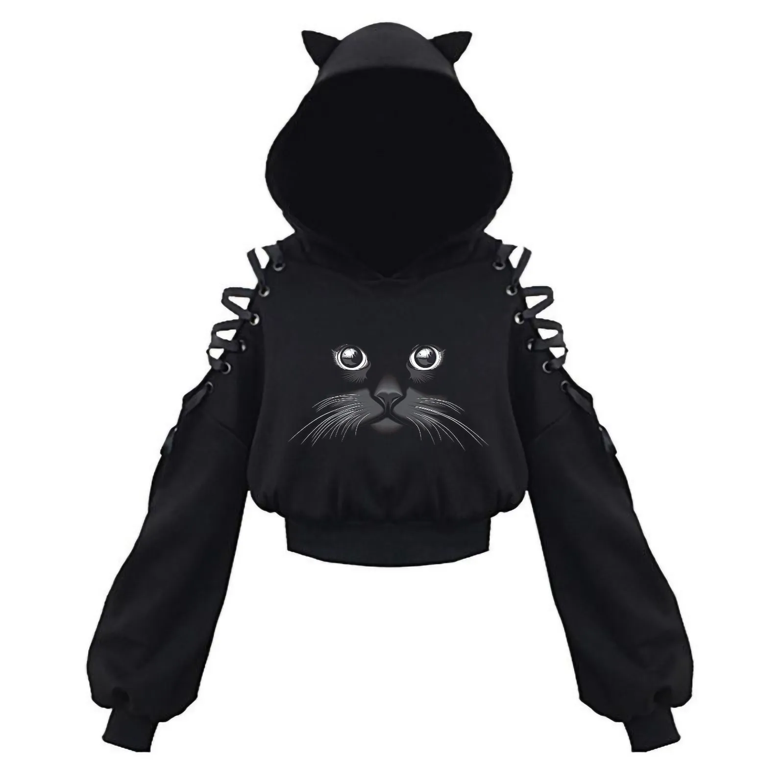 Женская толстовка с кошачьими ушками, пуловер, женская одежда с длинным рукавом и принтом кошки, женская одежда с капюшоном в стиле аниме, кавайная толстовка, худи оверсайз