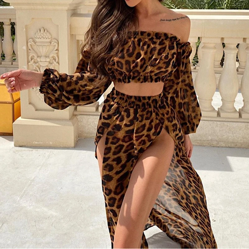 Женский комплект из 2 предметов, сексуальная накидка на бикини с леопардовым принтом, пляжная одежда, короткий топ с открытыми плечами и длинным рукавом + юбка макси с разрезом, купальный костюм
