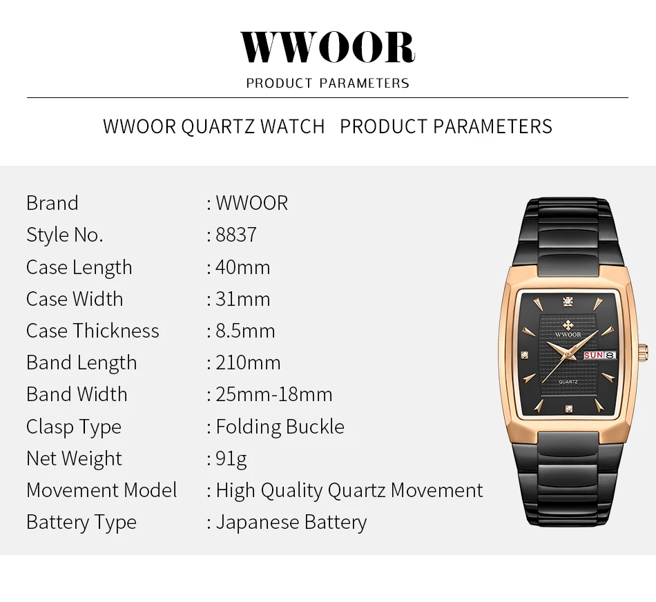 Особенности:-Механизм: кварцевый механизм с часовым модулем (Сделано в Японии)-Аккумулятор: японский аккумулятор импортированная батарея-Материал ремешка: нержавеющая сталь-12 месяцев гарантии движенияПриближение спецификации:-Диаметр корпуса: 40 мм-Толщина корпуса: 8,5 мм-Ширина ремешка: 20 мм-Общая длина: 20 мм Посылка-1 часы WWOOR-1 бирка WWOOR-1 x регулятор ремешка для часов (вы можете отрегулировать длину ремешка самостоятельно, не нужно ходить в магазин часов)