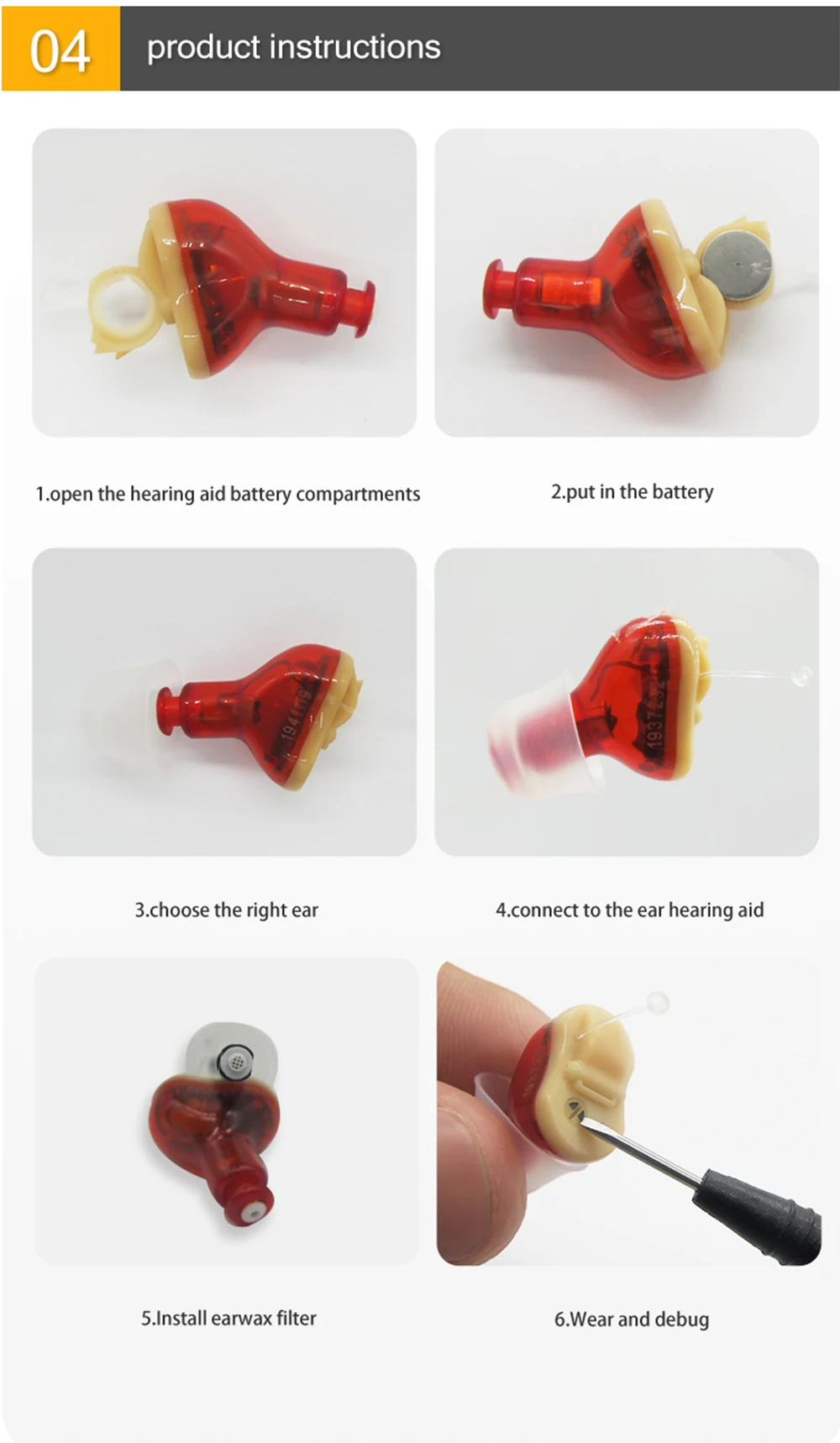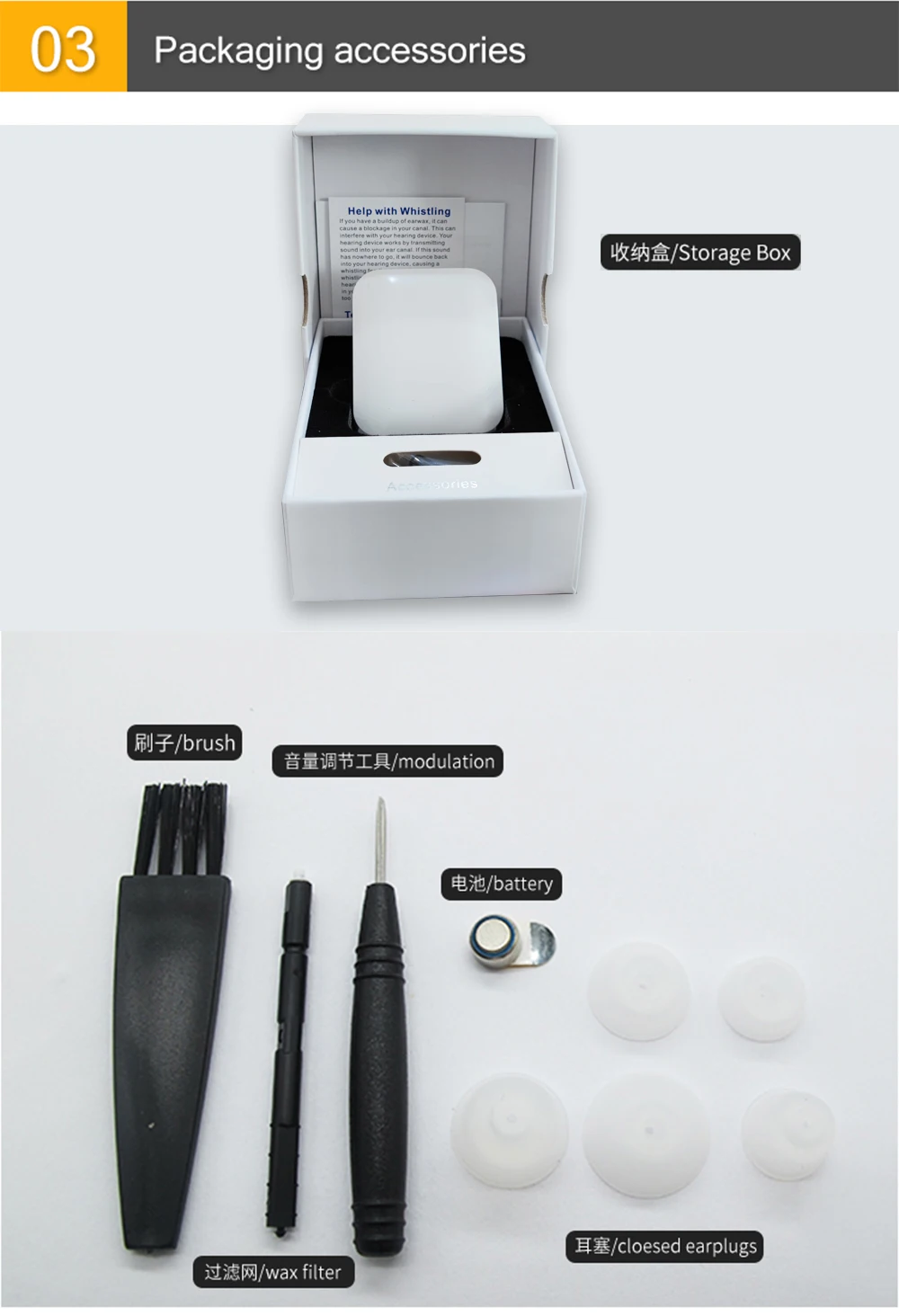 Название продукта: слуховые аппараты с внутренними ушамиЦвет: прозрачныйМатериал: пластикРазмер хоста: 1,8 см x 1,2 см x 0,9 смВес нетто: 300 гБатарея: A10Калибровка: АвтоматическаяЧастотный диапазон: 200 Гц ~ 7645 ГцРабочий ток: 1,0 мАЭквивалентный входной шум: 27,6 дБАксессуары в комплекте: наушники * 6Кисть * 1Батарея * 1 (2 батареи во время пары)Ушной фильтр * 1Инструмент регулировки громкости: * 1Руководство: * 1