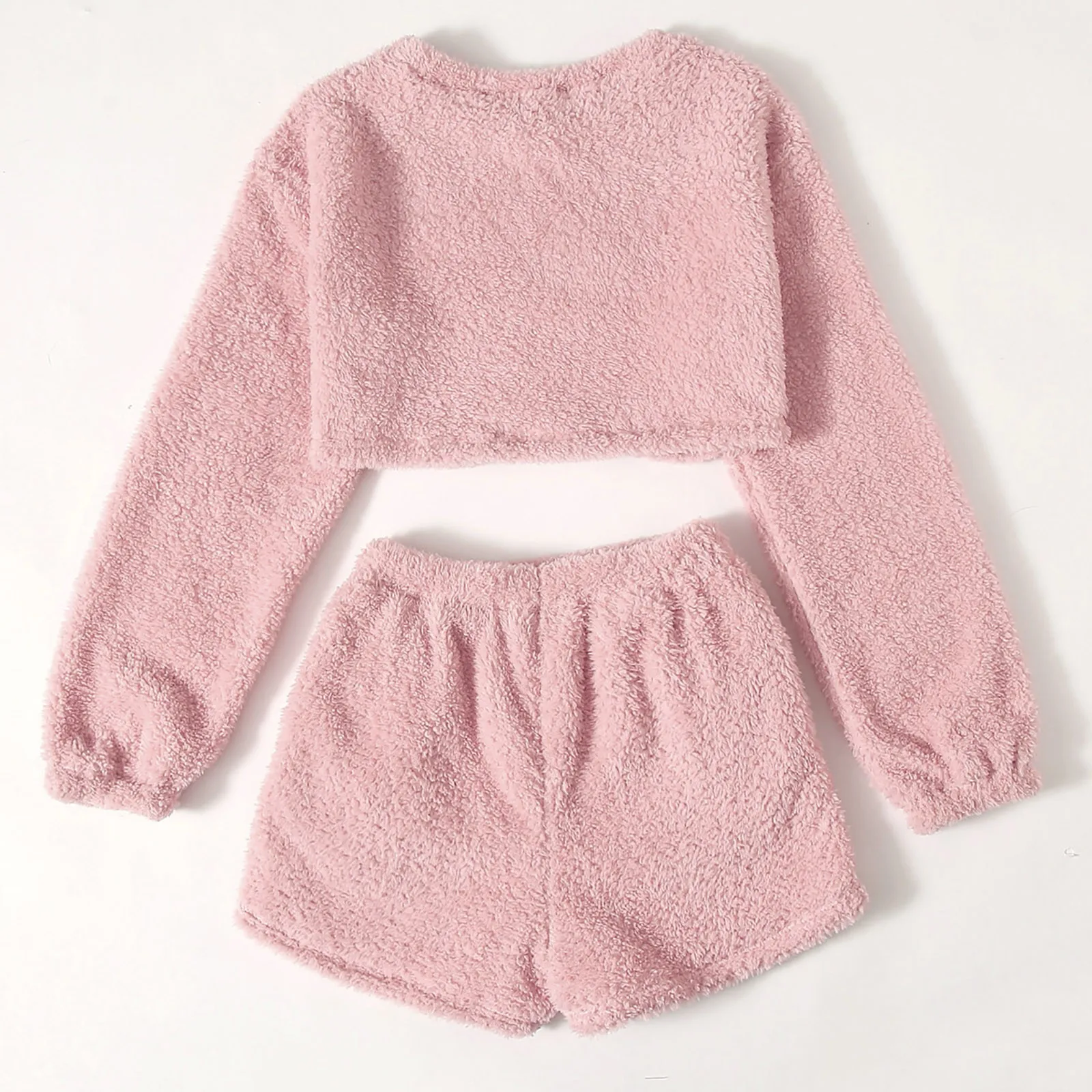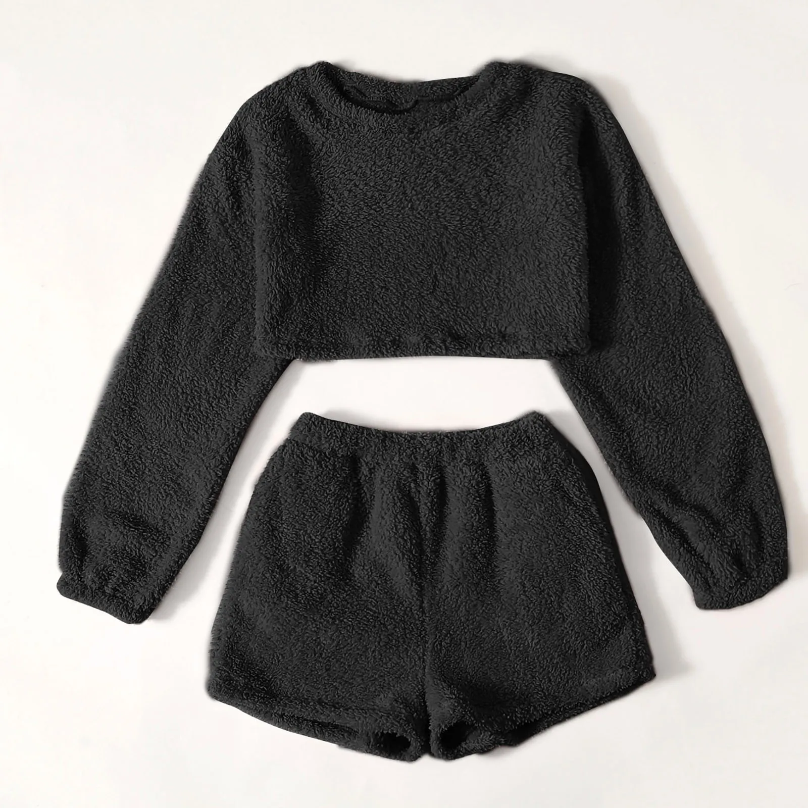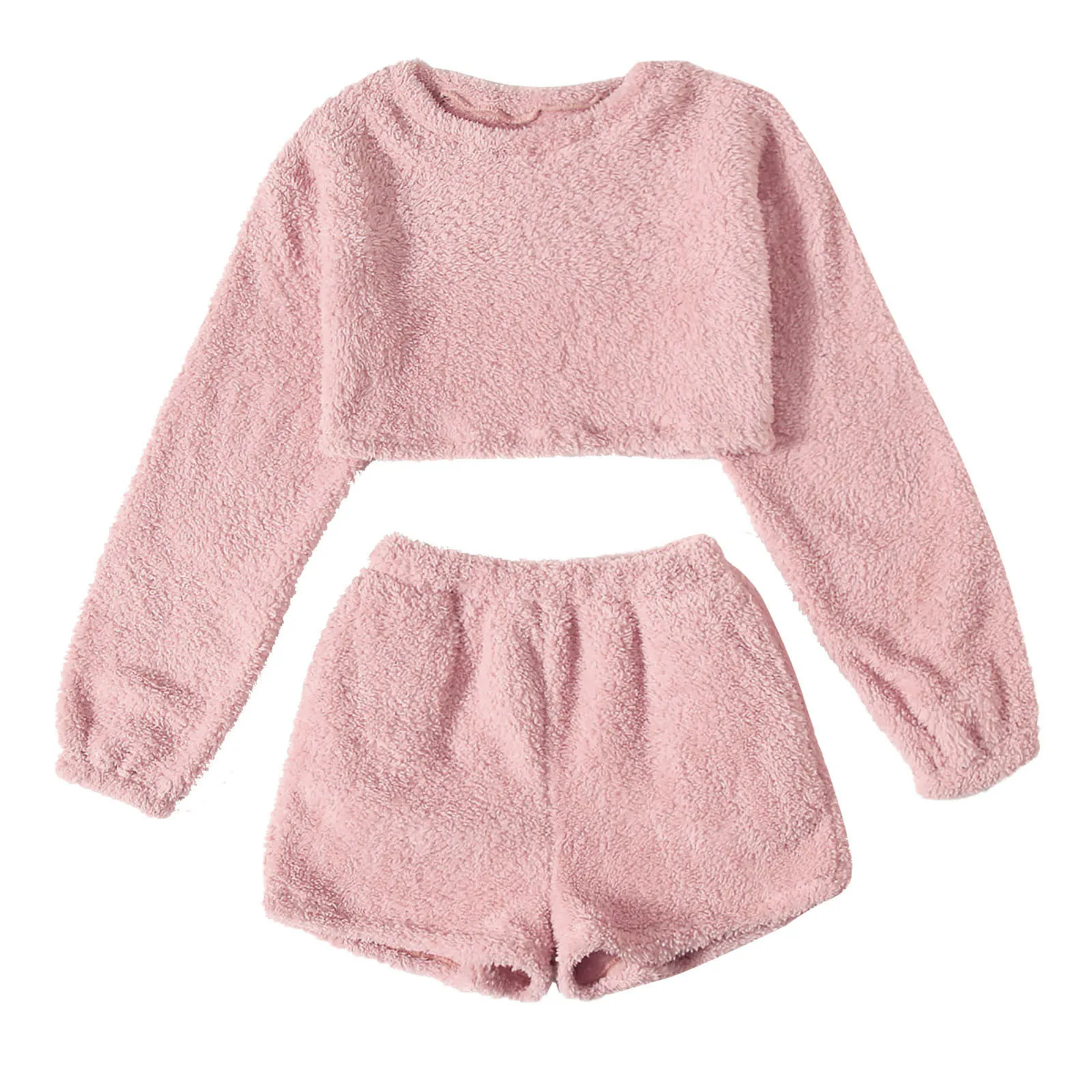 Зимний теплый Пижамный костюм, женский Однотонный пуловер с длинным рукавом и круглым вырезом, пижамный комплект, топ для отдыха + шорты, пижамы для женщин #40