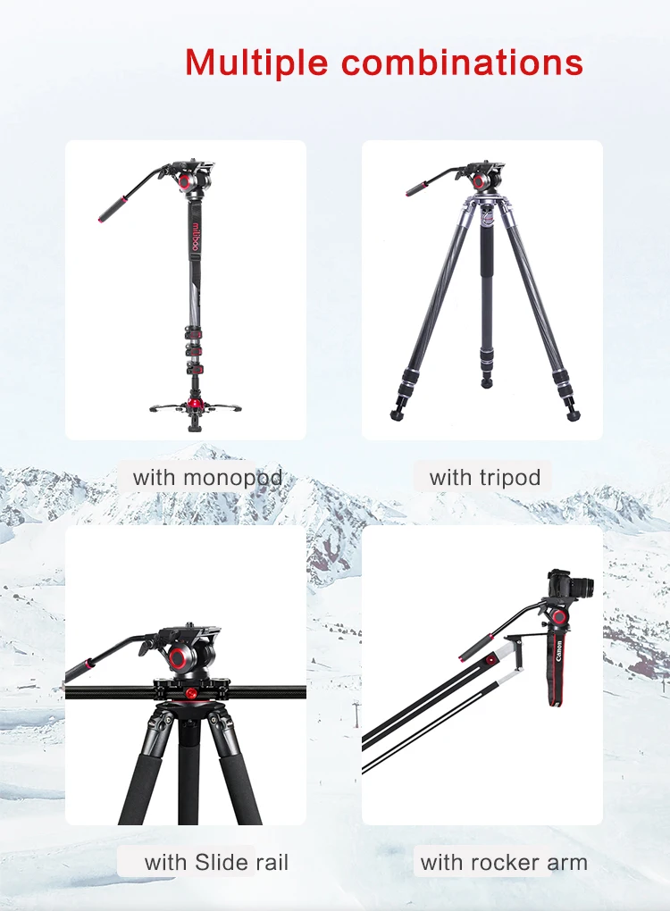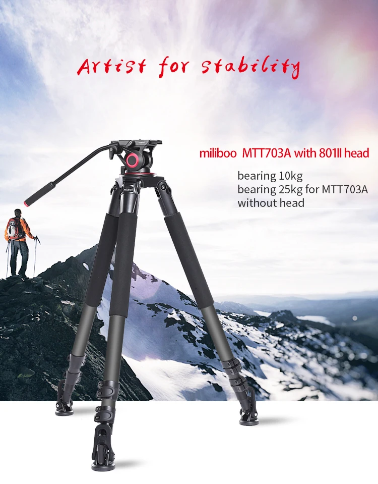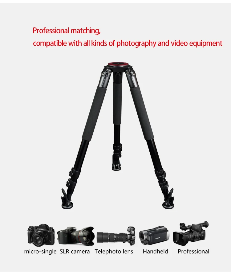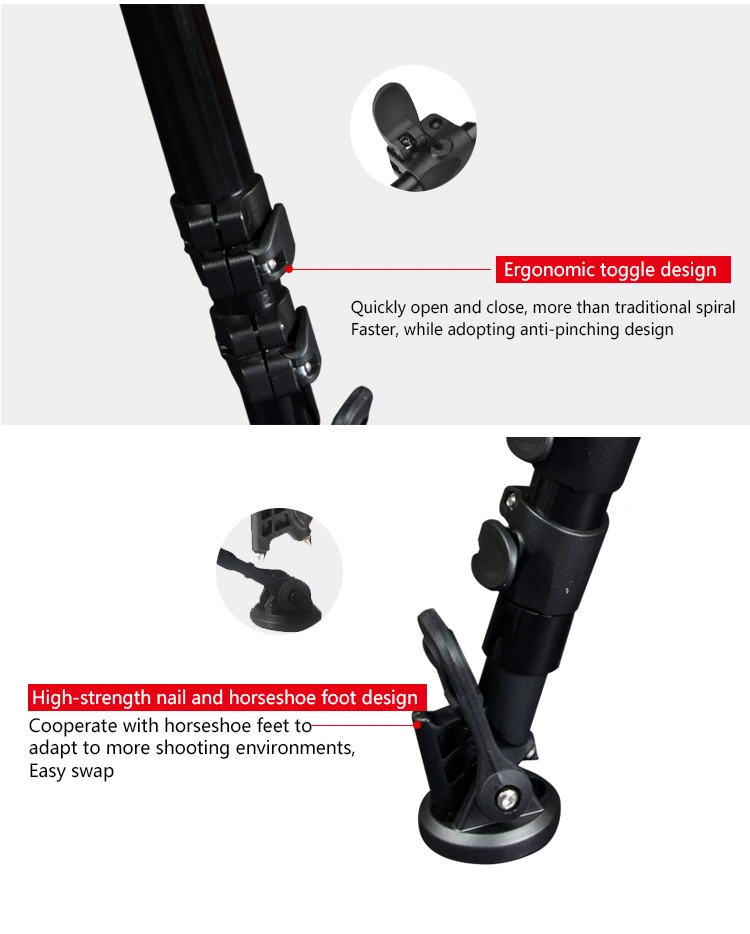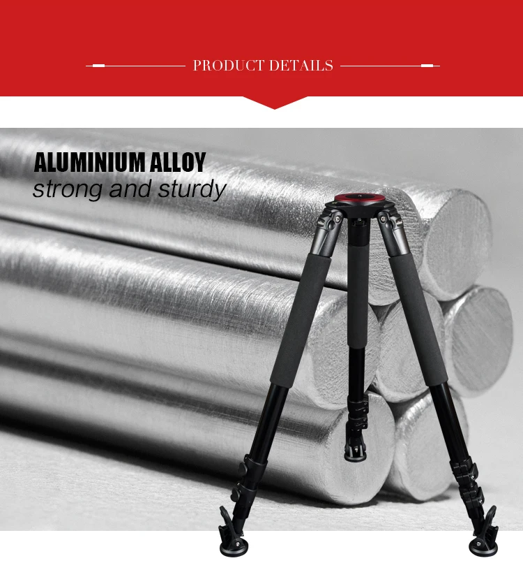 Алюминиевые 3 секции обеспечивают максимальную жесткость от самых легких компонентов, а максимальная трубка составляет 39 мм, а толщина стенки составляет 1,2 мм, что лучше, чем аналогичный продукт на рынке. Трехступенчатая Регулировка трубки, конструкция пряжки и преобразование дужки обеспечивают абсолютную стабильность во время видеосъемки и фотосъемки