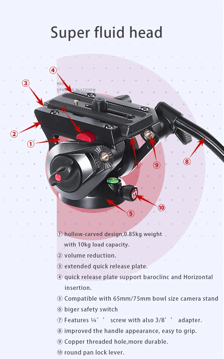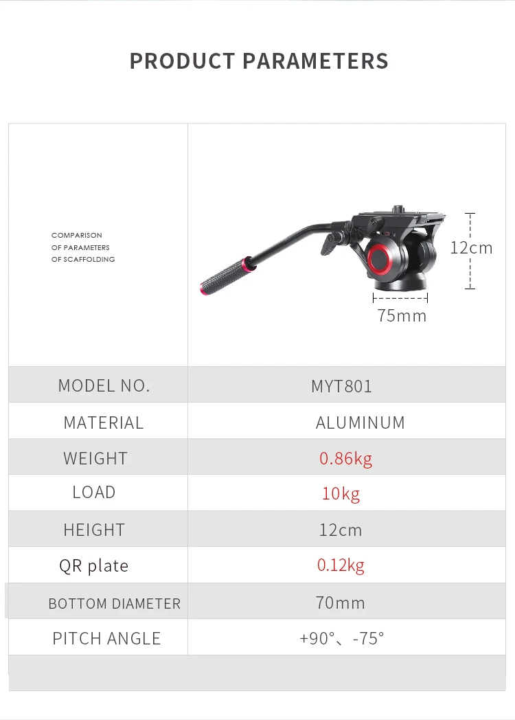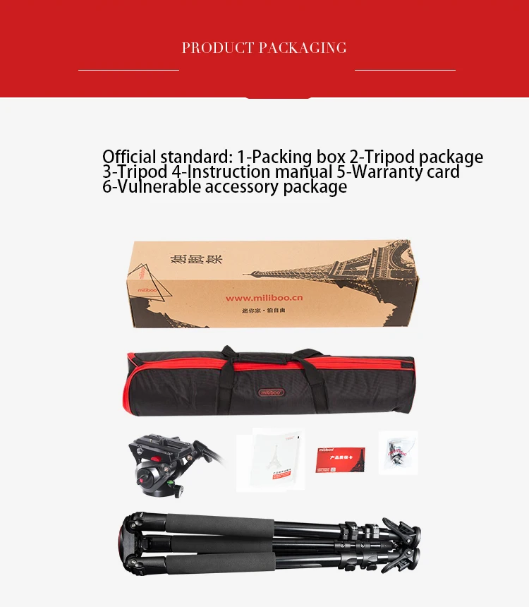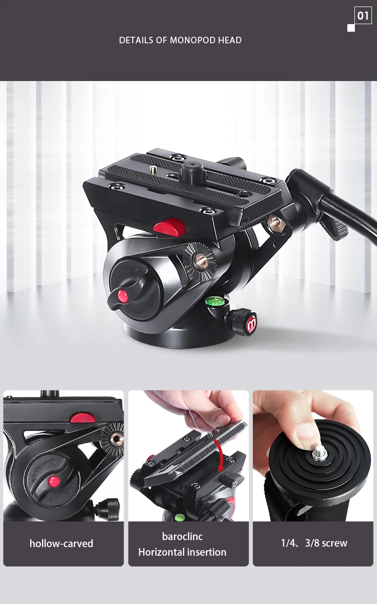 Алюминиевые 3 секции обеспечивают максимальную жесткость от самых легких компонентов, а максимальная трубка составляет 39 мм, а толщина стенки составляет 1,2 мм, что лучше, чем аналогичный продукт на рынке. Трехступенчатая Регулировка трубки, конструкция пряжки и преобразование дужки обеспечивают абсолютную стабильность во время видеосъемки и фотосъемки