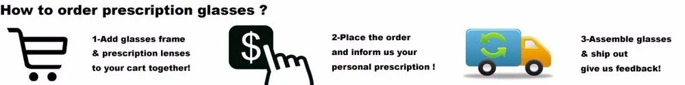 4. Пожалуйста Отправьте нам правильный рецепт (как сфера, цилиндр, ось, PD и Дополнение и т. д.) и требования к заказу на комментарии при заказе, или Загрузите фотографию в сообщении о заказе, мы установим линзы в Оправа, чтобы отправить вам полные очки, мы используем европейскую импортированную автомобильную машину для резки объектива, чтобы гарантировать Качество, 100% качество Гарантия.