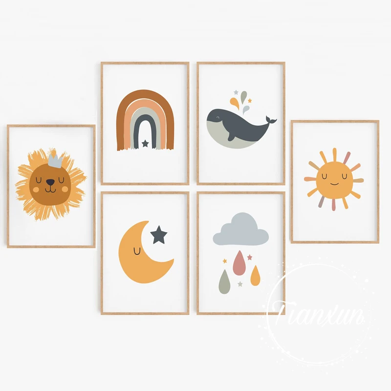 Плакат с изображением Луны, радуги, солнца, звезд, печать на холсте, настенная декоративная картина для детской комнаты