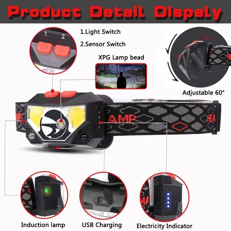 2. Фара содержит аккумулятор. Вы можете использовать зарядный USB-кабель для фары.3. Он имеет два переключателя, один из стандартных переключателей и индукционный переключатель пальца.4. 6 режимов освещения: XPG высокий-XPG слабысветильник-COB Белый свет Блик-COB светильник свет слабый светильник-COB красный свет Блик-COB красный светильник мигает5. Перезаряжаемый-2 часа быстрой зарядки для длительного использования! Никогда не нужно покупать аккумуляторы или заряжать слишком часто, Одна зарядка на дни достаточного использования!6. Легкий и компактный-один из самых легких фар, который вы когда-либо покупаете. Легко установить и собрать, в любое время для удобного и портативного использования.7. Может использоваться как фараС регулируемым оголовьем вы можете использовать более комфортноЛегко и удобно наносится и снимается8. Питание: В комплект входит аккумулятор9. Когда шнур подключен, будет синий светильник