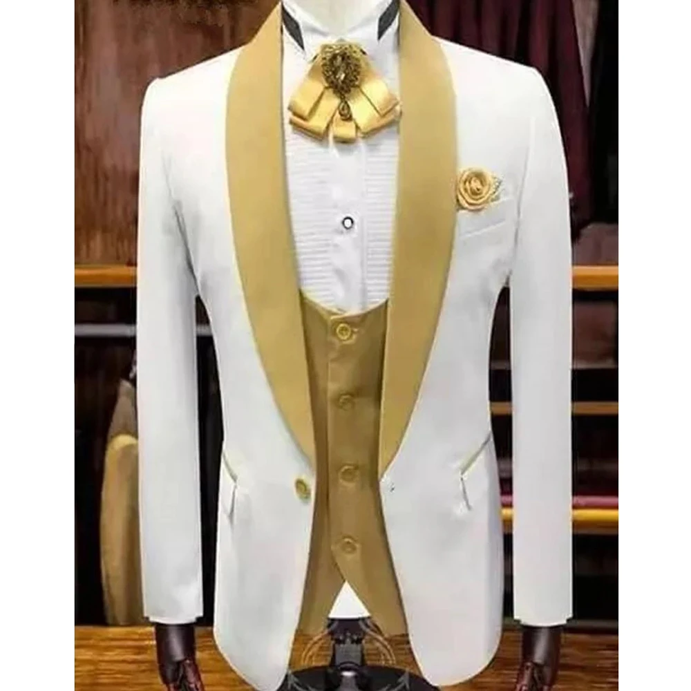 Белый свадебный смокинг для жениха с золотой шалью и отворотом, 3 предмета, индивидуальный приталенный мужской костюм, модная мужская одежда