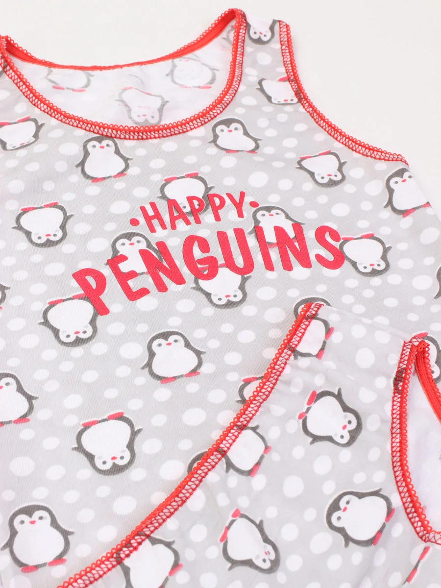 Комплект для девочки (майка и трусы) из коллекции «Ms Peng» выполнен из 100% хлопка (кулирка). Кулирка - тонкое и мягкое трикотажное полотно, легкое и воздухопроницаемое. Идеальный вариант для нательного белья, пижам, домашних и летних костюмов. Ткань не закатывается в катышки, хорошо растягивается в ширину и практически не тянется в длину. Майка прямого кроя, с округлым вырезом горловины дополнена милым бантиком. Главная фишка – забавные пингвины. Ткань легкая, приятная к телу, хорошо пропускает воздух. Подойдет для жаркой погоды.