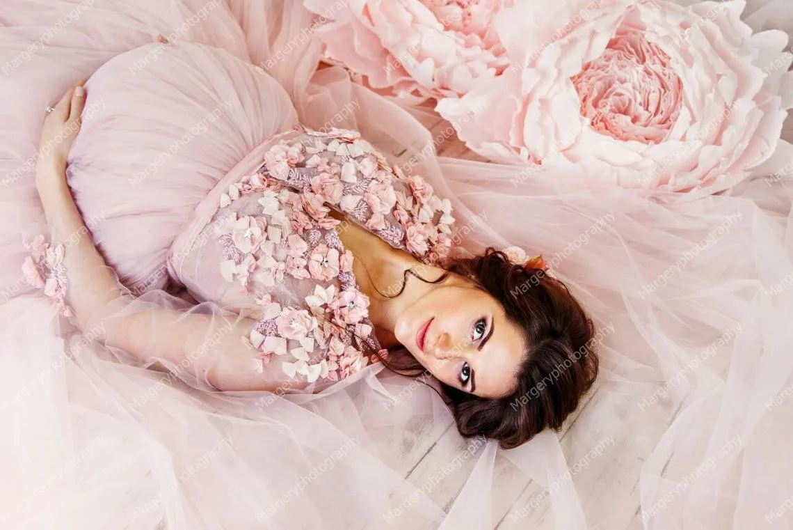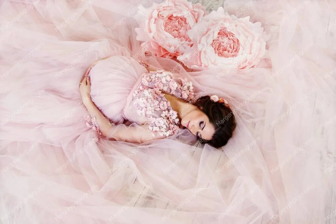 Роскошный цветок Беременность платья для фотосессии одежда с длинным рукавом v-образным вырезом из мягкого фатина размера плюс с длинным шлейфом, платья для будущих мам