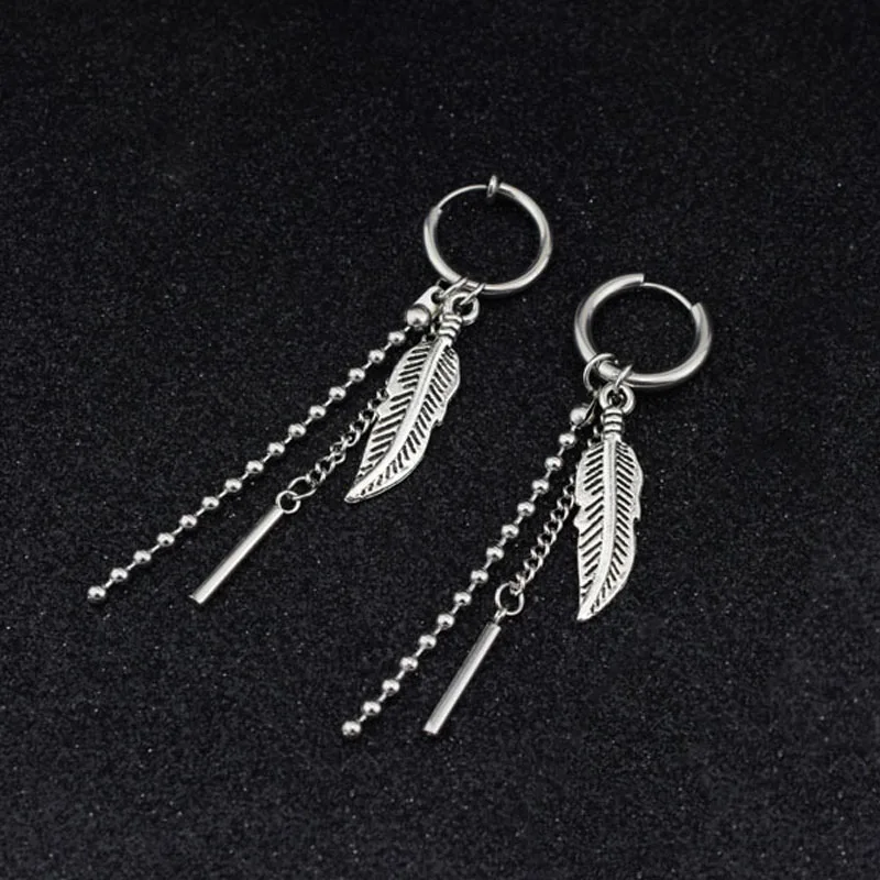 Серьги-гвоздики мужские из нержавеющей стали в стиле панк, длинная цепочка с кисточками, листьями, луной, рок, пирсинг в стиле хип-хоп, ювелирные украшения для мальчиков, 1 шт.