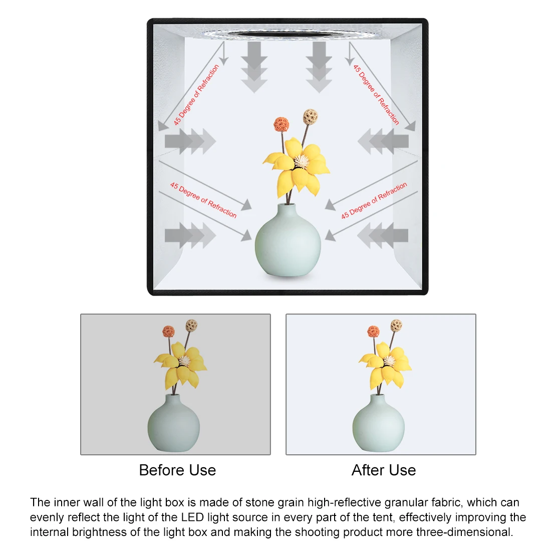 1. Светильник для фотосъемки специально разработан для маленьких энтузиастов, ремесленников, художников, продавцов etsy и других онлайн-продавцов, профессионалов и рекламодателей продуктов. 2. Маленькая студия может быстро и легко фотографировать мелкие предметы, такие как ювелирные изделия, аксессуары, игрушки, часы, гаджеты и другие предметы. 3. Легко собрать (реальные три секунды для сборки и использования), вы можете развернуть этот светодиодный светильник и разместить его на любой поверхности, чтобы получить хороший фон для Коммерческой фотографии мелких предметов и сделать фотографии продукта. 4. Портативный складной дизайн, проще в установке и переноске, Встроенный светодиодный светильник, обеспечивает средний Светильник, предотвращает появление теней и отражения на фотографии. 5. Принять CRI95 цветной температурный кольцевой светильник, встроенный камень текстура ткани, хороший эффект конденсации. 6. Быстрое хранение, хороший трехмерный эффект сарая. 7. Изысканная цветная упаковка, красивая атмосфера.
