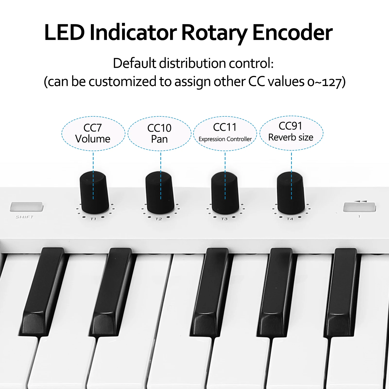 Имеет много функций и прост в использовании. С usb-подключением вы можете наслаждаться музыкой, когда захотите. Включенный В Комплект руководство пользователя поможет вам быстро понять особенности и операции этой миди-клавиатуры. Особенности: Драйвер не нужен, питание от USB и внешняя мощность не требуется. Так что его удобно носить. Емкостные сенсоры для управления шагом/модуляцией. Особенности с сдвигом для индивидуальных функций и октава/транспоза. 4 настраиваемые ручки: T1 (громкость), T2 (панорама), T-3 (контроллер экспрессии), T4 (реверберация). Портативный размер для удобной переноски. Дизайн с ключевым размером является разумным и компактным, удобно использовать. Светодиодный дисплей для точного управления. Совместимость с различными музыкальными компоновками. С противоскользящей резиновой прокладкой для более безопасного использования. Характеристики: Основной цвет: белый Основной материал: пластик Ключи: 37 клавиш Максимальное количество полифона: 64 Размер изделия: 570*135*35 мм/22,4*5,3 * 1.4in Вес изделия: 1358 г/3,0lb Размер посылка: 635*200*100 мм/25,0*7,9*3,9 дюймов Посылка Вес: 2048 г/4.5lb Упаковочный лист: 1 * электронная клавиатура 1 * USB кабель 1 * Руководство пользователя
