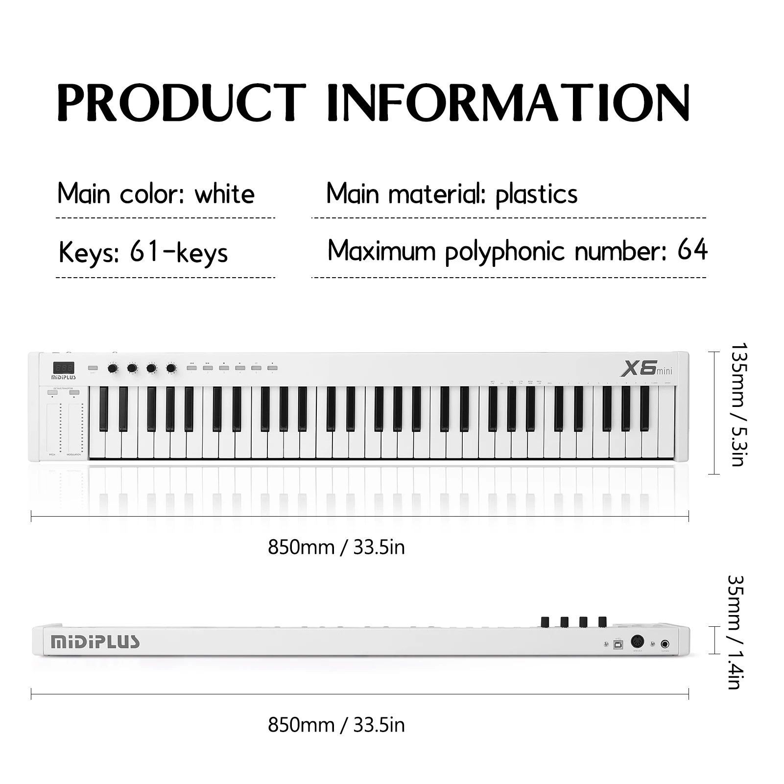 Имеет множество функций и прост в использовании. Благодаря USB-соединению вы можете наслаждаться музыкой, когда захотите. Прилагаемое Руководство пользователя поможет вам быстро понять функции и функции этой midi-клавиатуры. Особенности: Драйвер не требуется, питание от USB и внешнее питание не требуется. Удобно носить с собой. Сенсорные датчики Capactive для управления шагом/модуляцией. Особенности со сдвигом для индивидуальных функций и октавы/Транспозиции. 4 настраиваемых ручки: T1 (громкость), T2 (панорама), T-3 (контроллер выражения), T4 (реверберация). Портативный размер для удобной переноски. Дизайн разумного размера и компактности, удобство использования. Светодиодный ным дисплеем для точного управления. Совместим с различным программным обеспечением для расположения музыки. С противоскользящей резиновой прокладкой для более безопасного использования. Характеристики: Основной цвет: белый Основной материал: пластик Ключи: 61 клавиша Максимальное количество полифонов: 64 Размер изделия: 850*135*35 мм/33,5*5,3 * дюйма Вес изделия: 2085 г/фунта Посылка: 930*200*100 мм/36,6*7,9 * 3.9in Вес посылка: 2824 г/фунта Упаковочный лист: 1 * электронная клавиатура 1 * USB кабель 1 * Руководство пользователя