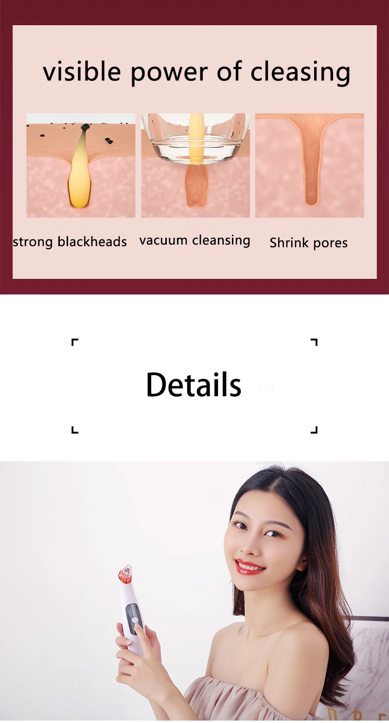 【Несколько функций 】многофункциональный косметический инструмент, который смешивает отшелушивающие, укрепляющие, поры очистки, акне и угрей удаления в одном. А также Функция горячего сжатия. 【Вакуумная система всасывания может мягко поднимать и массировать кожу, способствует циркуляции крови и лимфы, способствует метаболизму, тем самым обеспечивая изобилие питания для кожных тканей, затягивает и осветляет кожу. [Идеальный подарок] прекрасный подарок для всех, кто хотел бы быть ярче, вашего возлюбленного, подруги, дочери, семьи и многое другое, кто любит красоту. Ваше портативное устройство для ухода за кожей DIY! 【 6 сменных образцов 】шесть зондов разных размеров различных форм обеспечивают различный опыт всасывания, подходит для различных областей кожи и различных типов кожи. 【 3 Modes】 3 режима обеспечивают различные шестерни, подходят для различных типов кожи. Сухой режим (средняя передача), нейтральный режим (высокая передача), масляный режим (низкая передача). 【 Используйте rs дружественный дизайн 】 удобный размер как для домашнего использования, так и для использования дома. Зарядка от USB обеспечивает удобное беспроводное использование. Большой экран для более удобного использования.