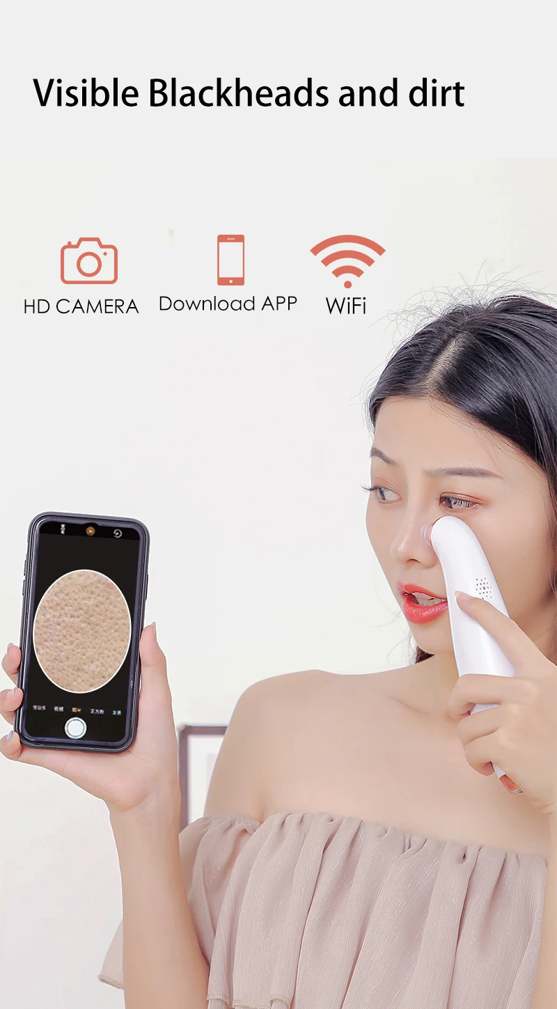 1. Визуальный измеритель угрей, увеличенный в 20 раз 2. 3D изогнутая поверхность сопла дизайн 3. 5 насадок для различных частей кожи. 4. Три модели с различной мощностью всасывания 5. USB зарядка, переносной 6. WIFI экран синхронизации в реальном времени