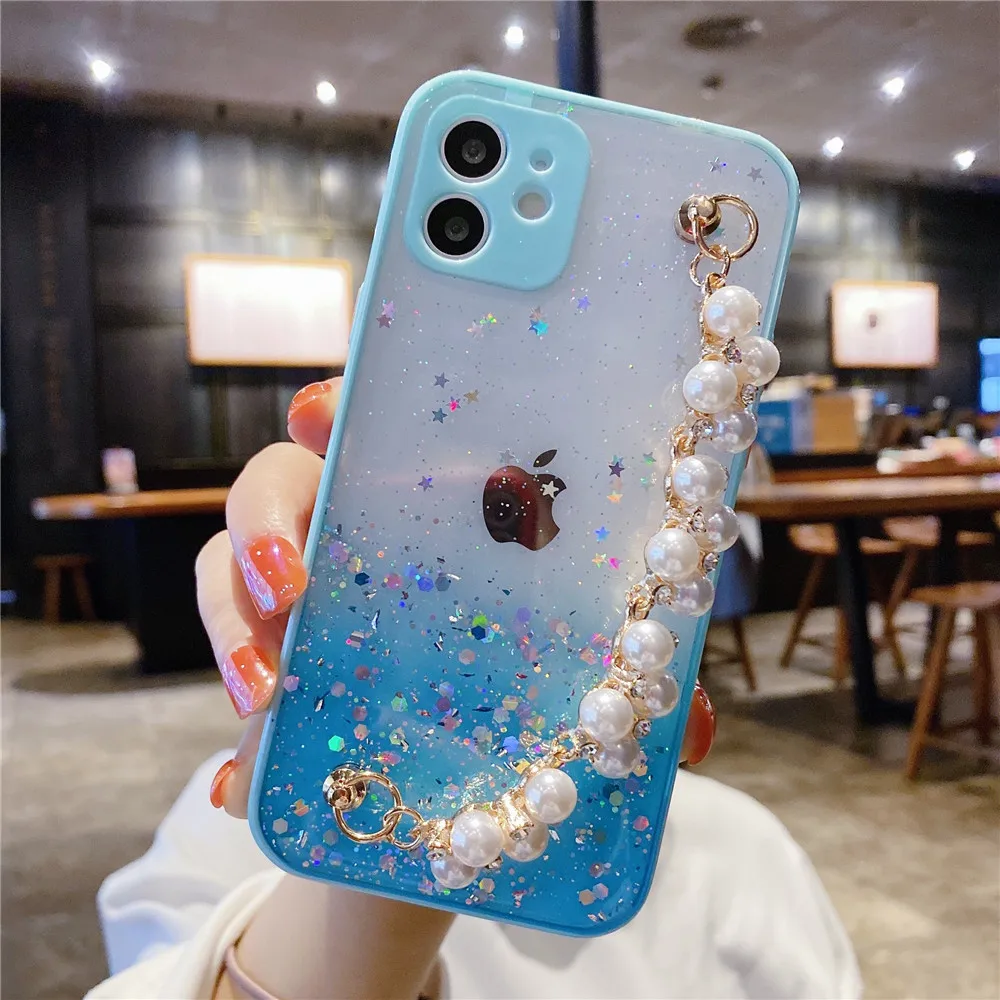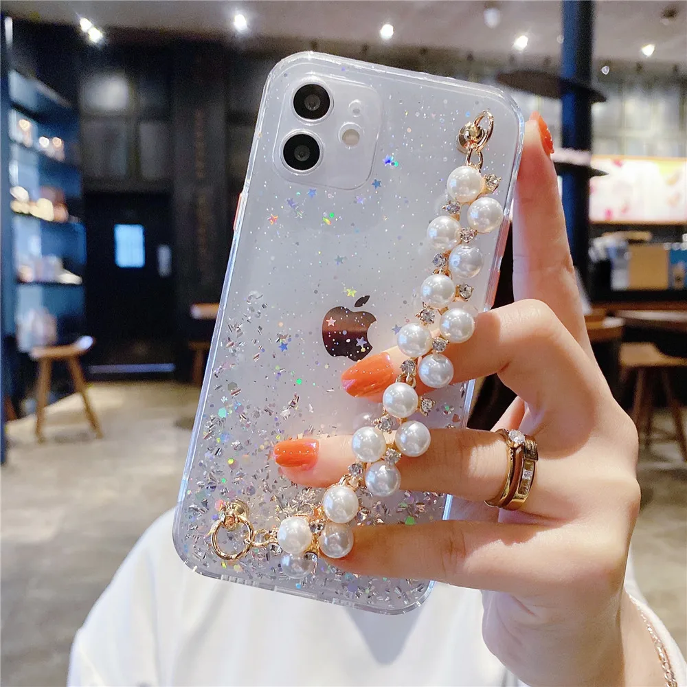 Чехол-накладка для Samsung S21, S20 FE, Note 20, A12, A52, A72, A51, A71, A50, A21S, A11, A31, A32, с блестками и жемчужным браслетом