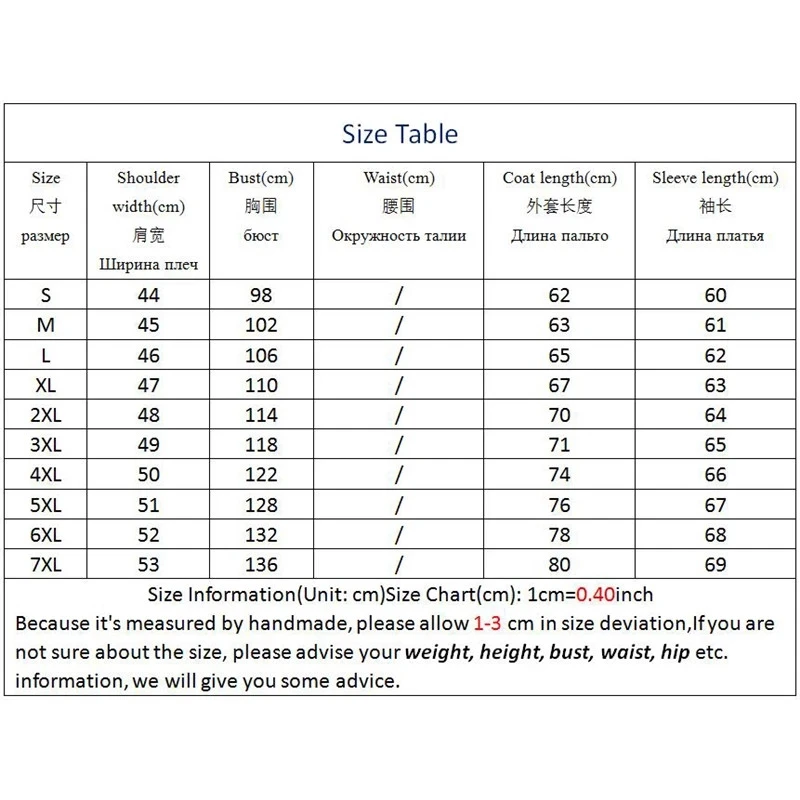 Информация о размере (единица измерения: см) Таблица размеров (см): 1 см =0,40Дюйм