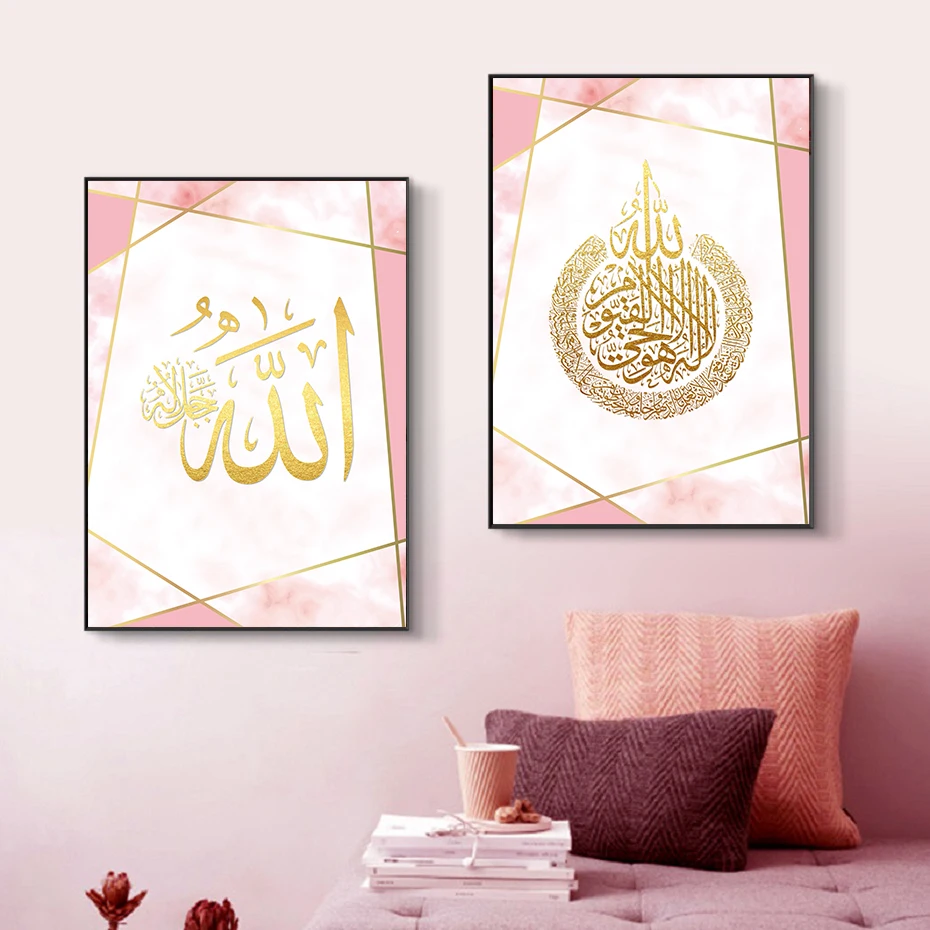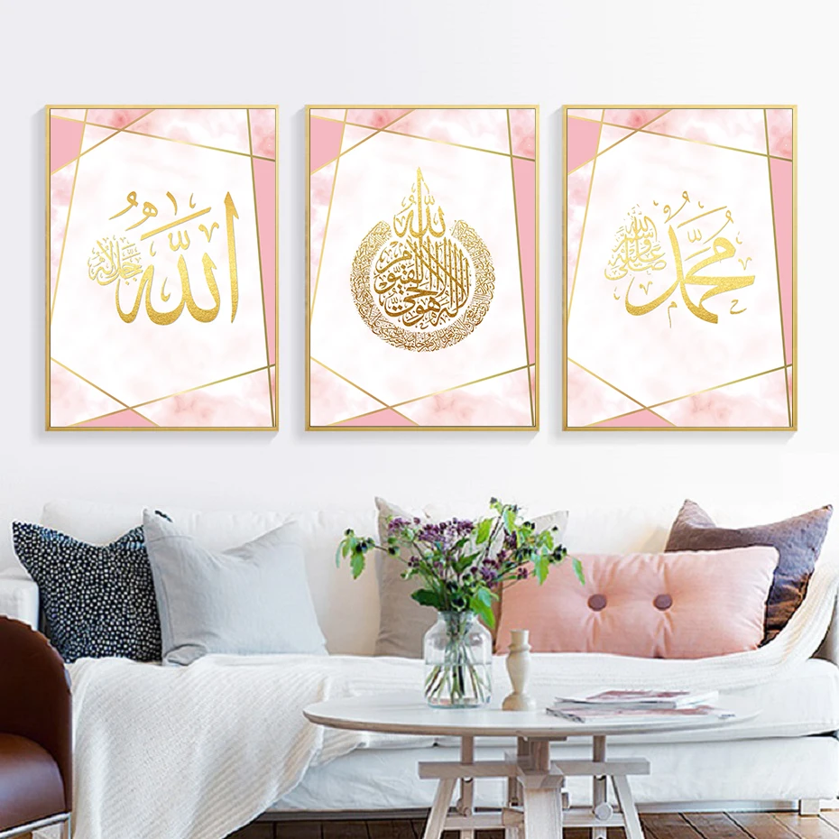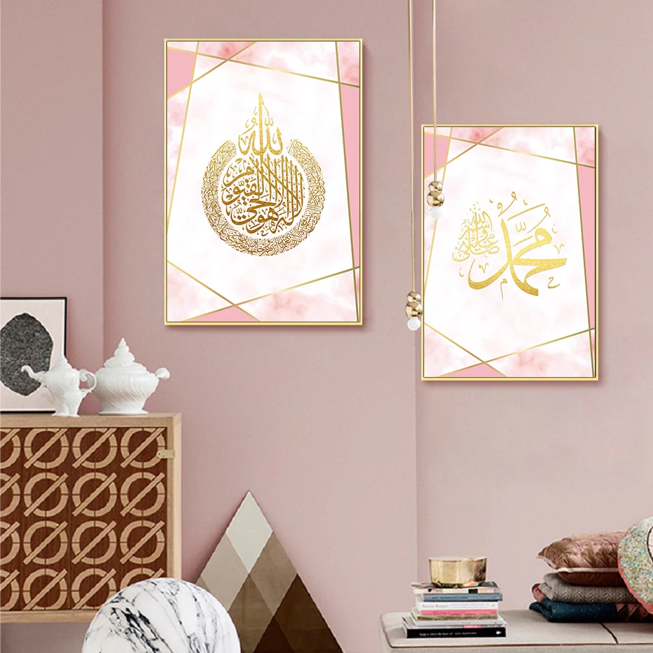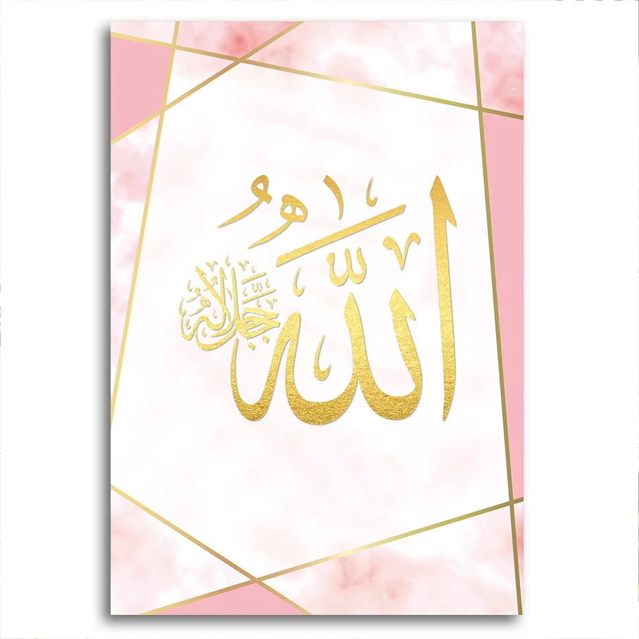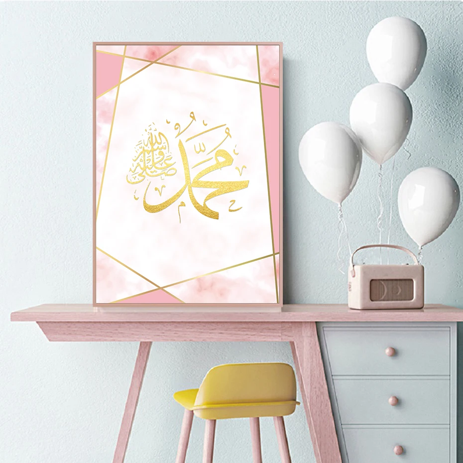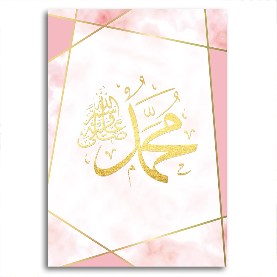 Розовое золото, исламское искусство, холст, Постер и принты Аллаха Мохаммеда, имя, каллиграфия, принт, картины, украшение для спальни, дома