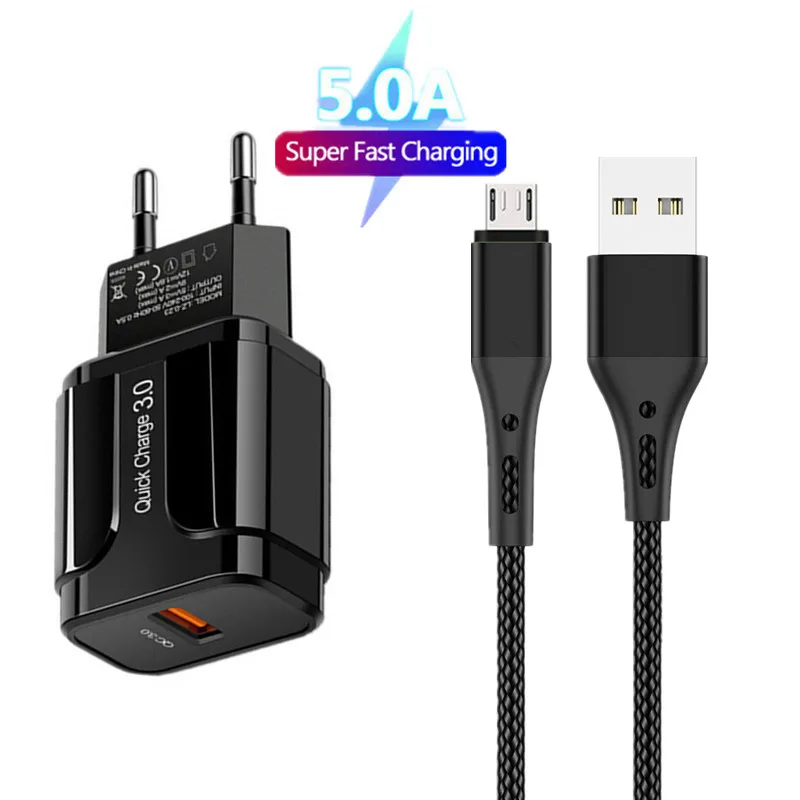 18 Вт QC3.0 настенное зарядное устройство для быстрой зарядки usb адаптер QC 3,0 быстрое зарядное устройство USB адаптер для Samsung S7 S6 Edge A7 A10 Huawei honor phone Micro usb кабель для передачи данных для Xiaomi Redmi 9C 9A 7A 6A 5A Note 4X 4 5 6 huawei P Smart 2019 и т. Д. Все (порт Micro usb) мобильный телефон, супер быстрая зарядка, нейлоновый провод.