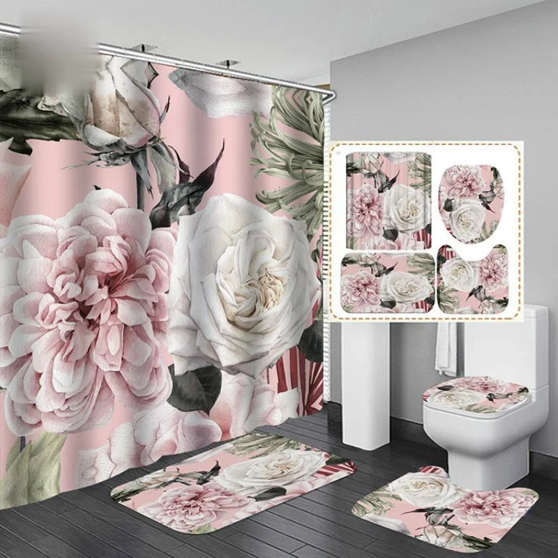 Набор штор для душа, с принтом розовых цветов, с ковриком, противоскользящий ковер, для ванны, унитаза, водонепроницаемый декор для ванной комнаты с крючками