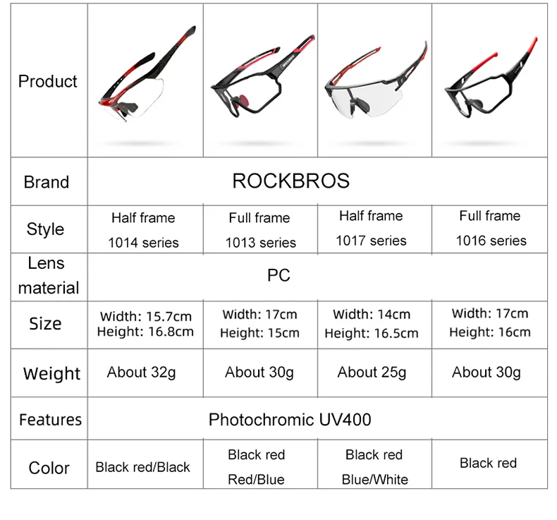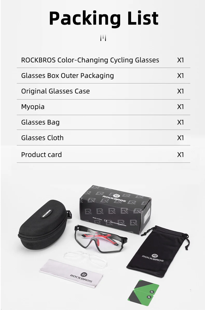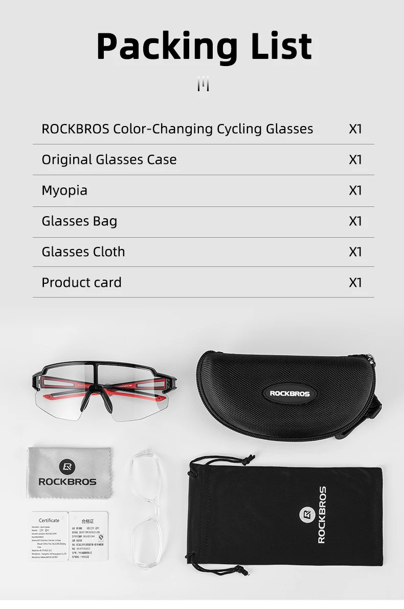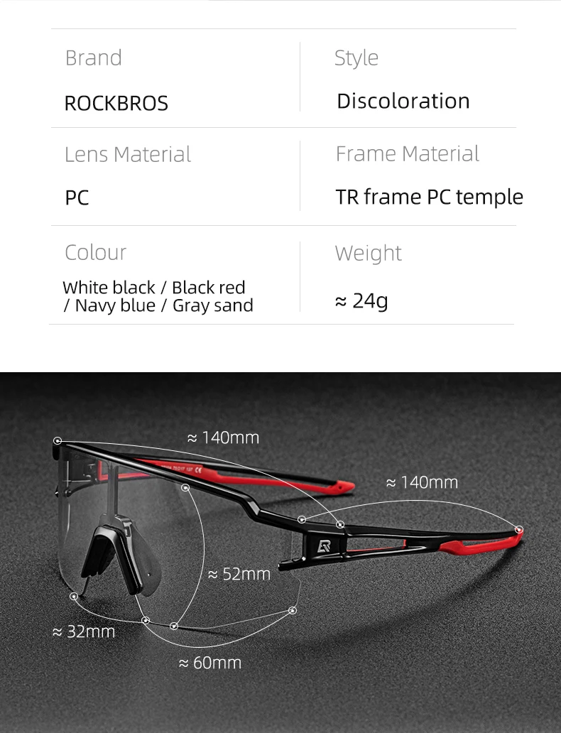 1. Бренд: ROCKBROS 2. Номер модели: велосипедные очки 3. Оптические характеристики линз: Фотохроматические 4. Тип спорта: езда на велосипеде 5. Вес: около 120 г/пара 6. Ширина линз: около 8 см 7. Высота линз: около 5 см 8. Материал линз: поликарбонат 9. Материал оправы: ацетат