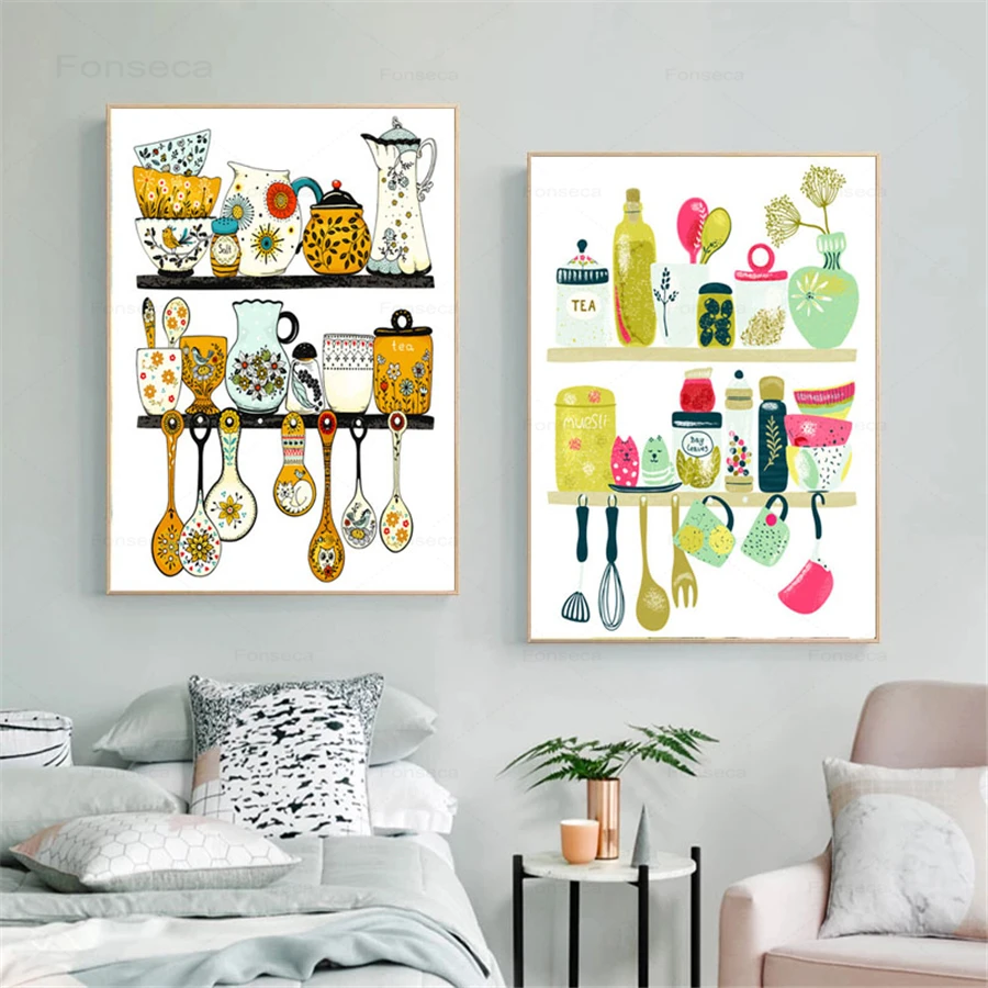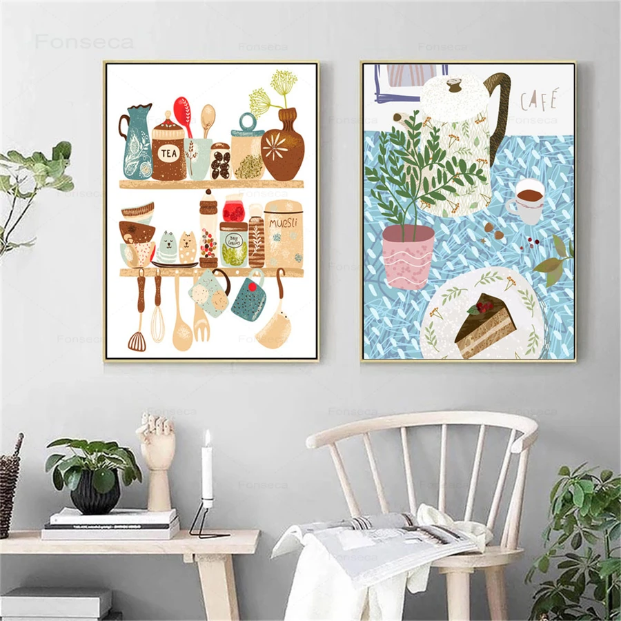Кухонная настенная декоративная Картина на холсте посуда чашки тарелки чаши кофейное растение десерт иллюстрация плакаты принты картины