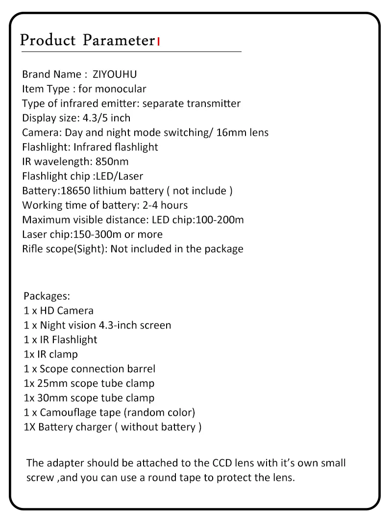Видео Запись ночного видения, со всеми креплениями, которые вам нужны, отверткой и пленкой camouflag, вы можете собрать его быстро в течение нескольких минут.