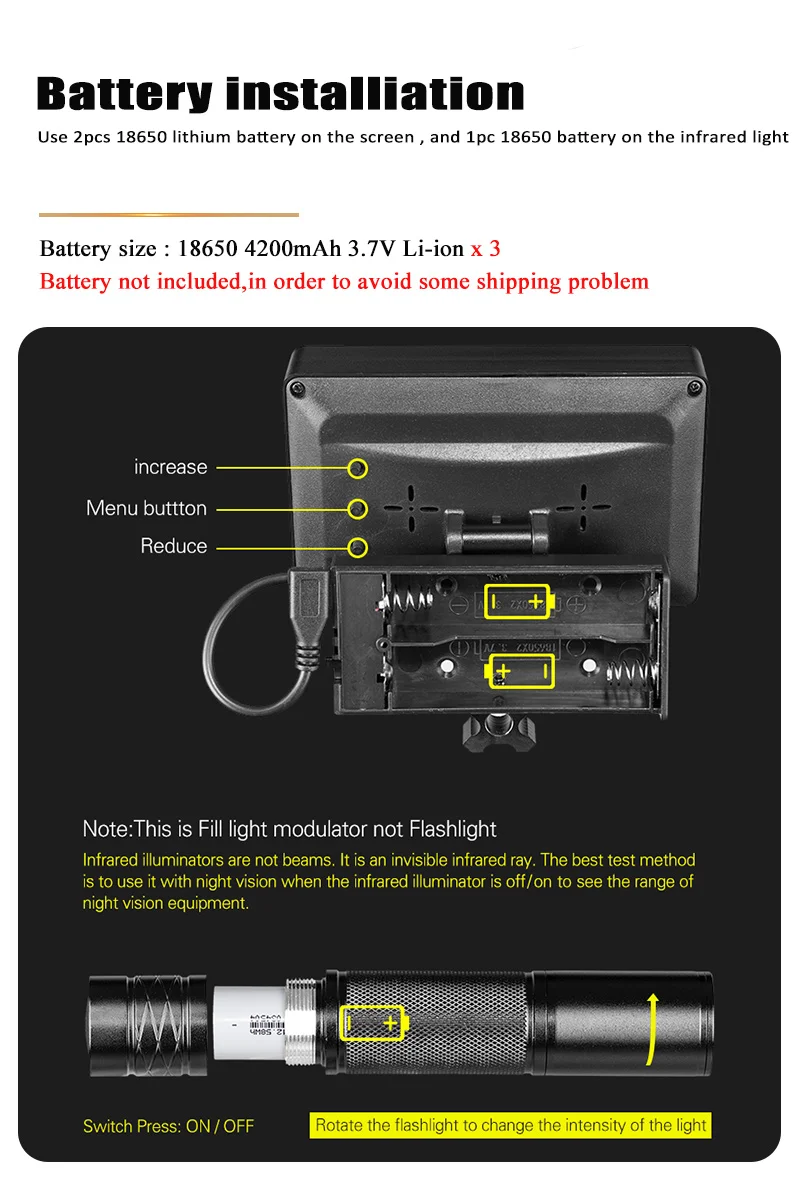 С набором видеомагнитофонов ночного видения, вы можете видеть и записывать любой объект в полной темноте. Чтобы вы могли наслаждаться охотой днем и ночью. Вы можете увидеть до 400 ярдов диапазон с ИК-светильник ночного видения. Идеально подходит для широкого спектра использования, таких как наблюдение, Ночная охота, наблюдение за дикой природой и исследования пещер и так далее.