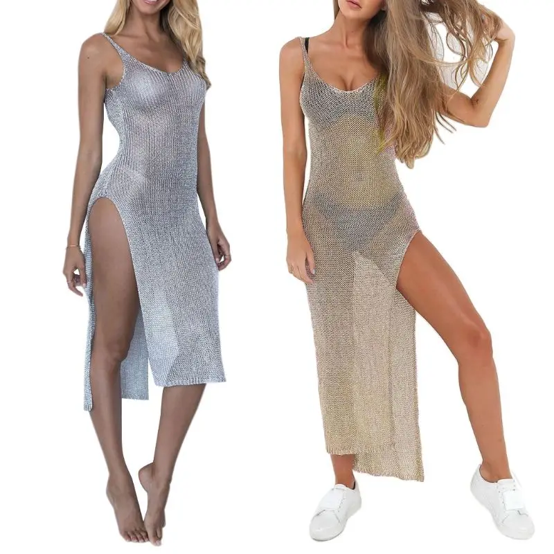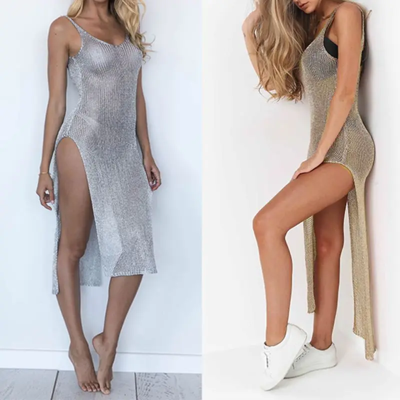 Женская модная летняя обувь солнцезащитный крем прозрачные сетчатые Бикини Cover Up металлик сплошной Цвет с низким вырезом на спине высокий разрез пляжные Клубные вечерние платье без рукавов