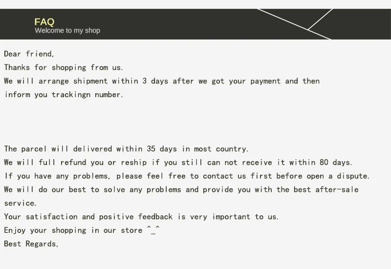 Лучшее обслуживание лучшая жизньДоставкаПри размещении заказа, пожалуйста, выберите способ доставки и оплатите заказ, включая стоимость доставки. Мы отправим товар в течение 3-5 дней после завершения оплаты.Обратите внимание, что покупатели несут ответственность за все дополнительные таможенные сборы, брокерские сборы, пошлины и налоги на импорт в вашу страну. Эти дополнительные расходы могут быть предъявлены вам к оплате при доставке. Мы не возмещаем стоимость доставки за отклоненные поставки.Стоимость доставки не включает налоги на импорт, и покупатели несут ответственность за таможенные пошлины.ВозвратМы вернем вам деньги, если вы вернете товар в течение 15 дней с момента получения товара по любой причине. Однако покупатель должен убедиться, что возвращенные товары находятся в их первоначальном состоянии. Если товары повреждены или утеряны, когда они возвращаются, покупатель будет нести ответственность за такой ущерб или потерю, и Мы не дадим покупателю полный возврат средств. Покупатель должен подать иск на транспортную компанию, чтобы возместить стоимость ущерба или убытков.При возврате товара Покупатель несет расходы за обратную доставку.Гарантия и обслуживаниеМы предлагаем бесплатную замену в течение 1 месяца. Покупатели могут запросить замену в течение 15 дней с момента получения товара. Покупатель должен возвратить нам товар в первоначальном состоянии и нести расходы по доставке при возвращении.Мы также предоставляем 12-месячное бесплатное обслуживание. Покупатель должен возвратить нам товар в первоначальном состоянии и нести расходы по доставке при возвращении. Если какую-то часть товара необходимо заменить, покупатель должен также оплатить расходы на части, которые должны быть заменены.Перед возвратом товаров, пожалуйста, подтвердите обратный адрес и способ доставки с нами. После того, как товар будет передан компании-перевозчику, пожалуйста, отправьте нам почтовый идентификатор. Как только мы получим товары, мы как можно скорее их отремонтируем или обменяем.ОтзывыУдовлетворение ваших запросов и положительная обратная связь очень важны для нас. Пожалуйста, оставьте положительные отзывы и 5 звезд, если вы удовлетворены нашими товарами и услугами.Если вы остались недовольны качеством товара и обслуживания, не торопитесь подтверждать получение товара и писать негативный отзыв. Сначала свяжитесь с нами. Мы сделаем все возможное, чтобы решить любые проблемы и предоставить Вам лучшее обслуживание клиентов.