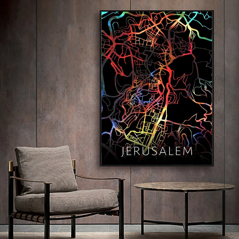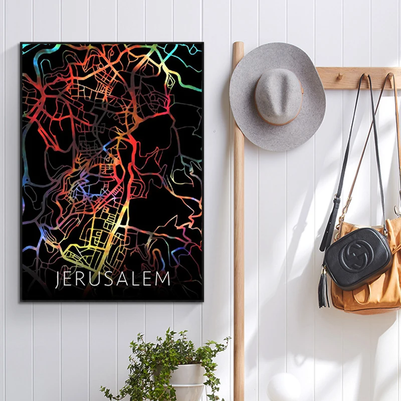 Картина на холсте черная карта города, акварель в Израиле, современный настенный постер, декор для гостиной
