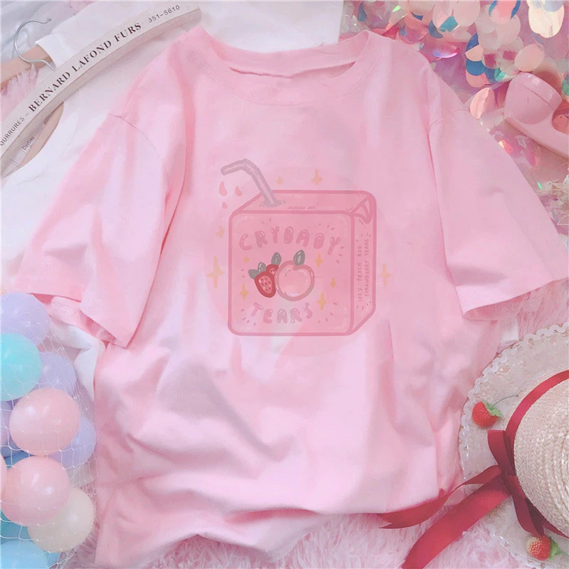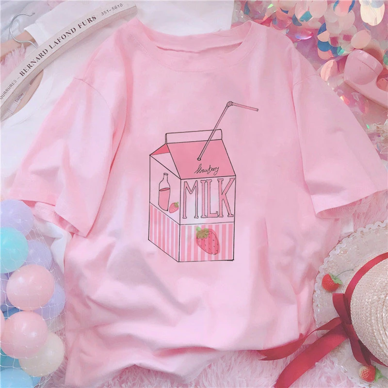 Футболка женская с рисунком клубники и молока, милый розовый топ с графическим принтом для девушек, Повседневная винтажная одежда для девушек
