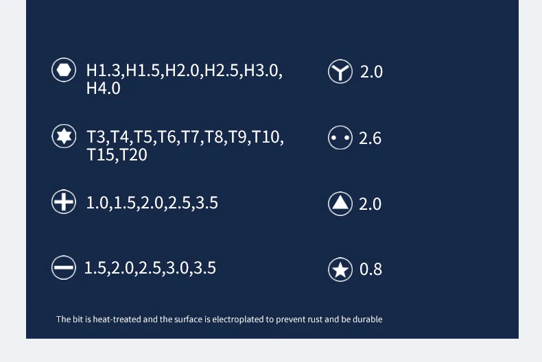 Phillips: 2 * PH0000 2PH000 2 * PH00 2 * PHO 2 PH1 2 * PH2 Прорези: SL1.0 SL1.3 SL15 2 * SL2,0 2 * SL2.5 SL3.0 SL3.5 SL4.0 Trx:T12T22 * T12T22 Трокс с отверстием: T6H T7H T8H T9H T10H T15H T20H T25H Пятиугольник: 2p2 【☆ 0,8 】 2 * p5 【☆ 12 】 P6 【☆ 1,5 】 P8 【☆ 2,0 】 Шестигранная: Шестигранная POZI: PZ000 PZ00 PZ0 PZ1 PZ2 Три точки: 2y0.62.02.53.0 Треугольники: △ 2,0 △ 2,3 △ 2,6 △ 3,0 Форма Ushape: 2*02,6 2 + 03,0 U8 Квадрат: S0 S1 S2 Средняя: W2.0 W2.0 SIM:0.81.0 4 мм разъем: M2. М3, 0 м3. M4.0 M4.5 M5.0 M5. 5 IICS: PH2