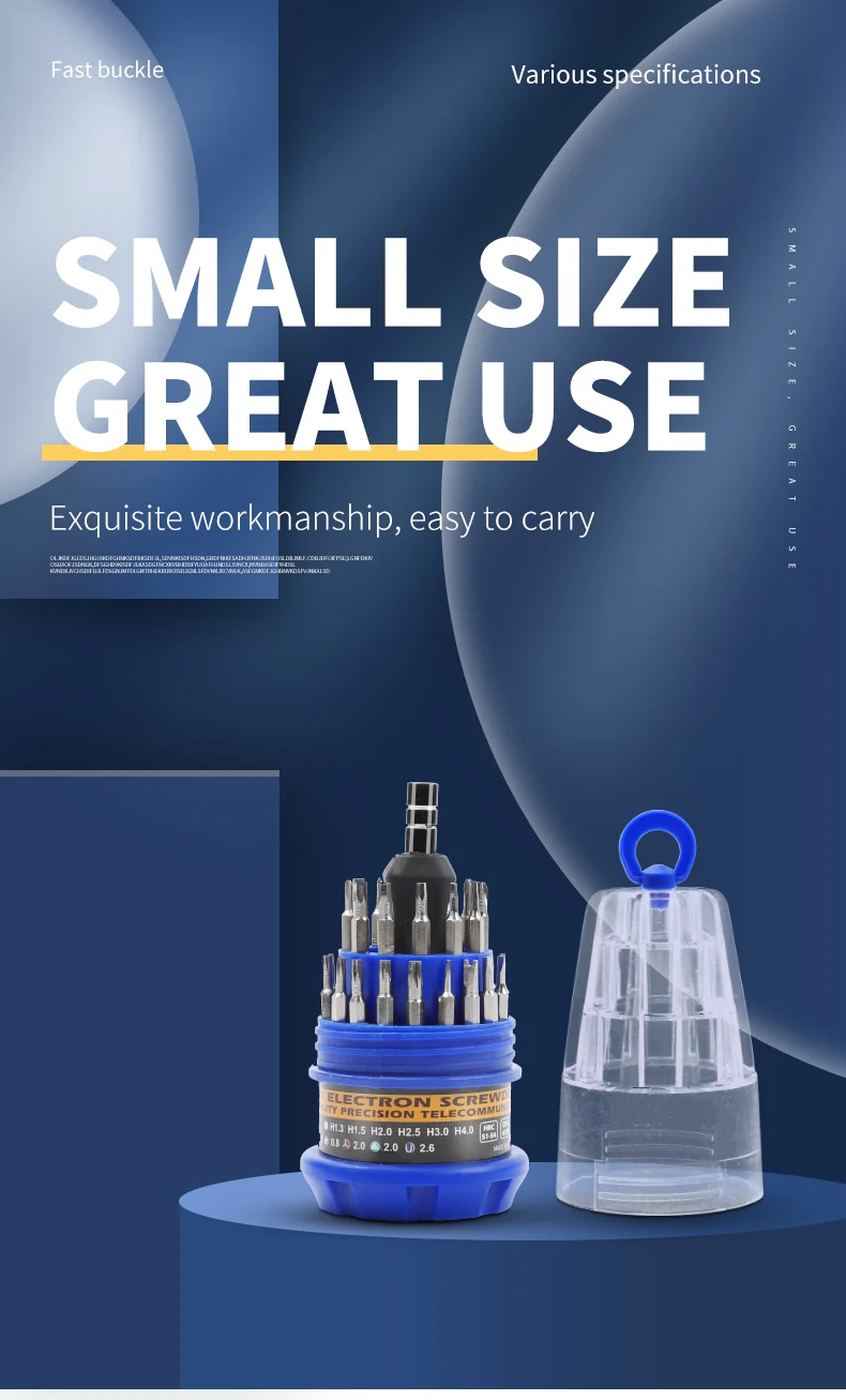 30 бит отвертки + 1 ручка отвертки Ручка отвертки x 1 Torx: T3 T4 T5 T6 T7 T8 T9 T10 T15 T20 Шестигранная: H1.3 H1.5 H2.0 H2.5 H3.0 H4.0 Flathead: 1,5 2,0 2,5 3,0 3,5 Phillips: 1,0 1,5 2,0 2,5 3,5 Три точки: 2,0 Треугольник: 2,0 Гаечный ключ: U2.6