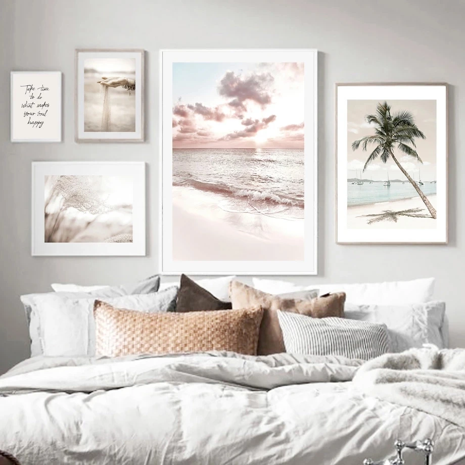 Бежевый, розовый Цвет пляж пальмы мост ландшафт с морскими волнами холст для живописи Wall Art Nordic Плакаты и принты модульная фотографии
