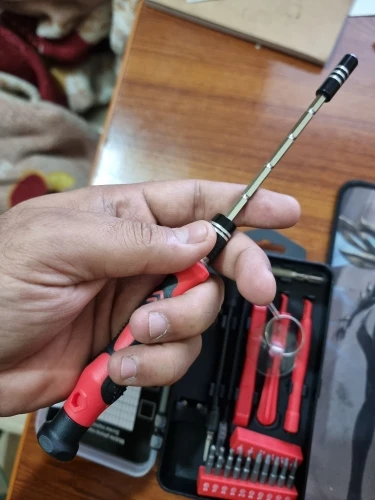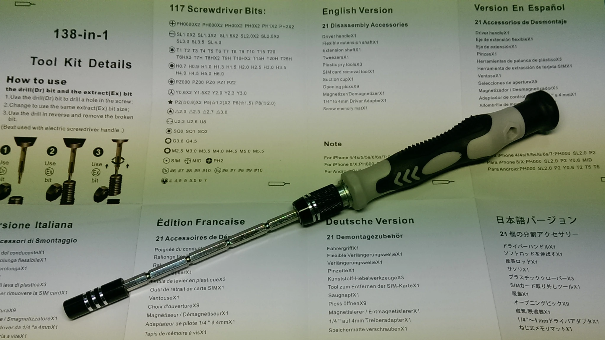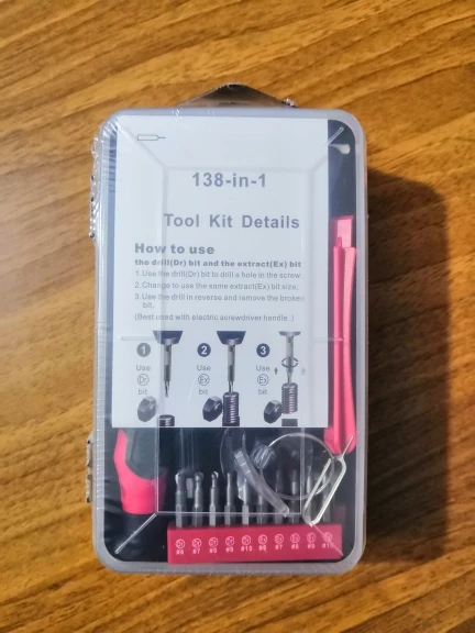Богатый набор в компактной упаковке, ассортимент насадок под любые нужды. Отвёртка телескопическая. Качество временем проверится. Покупался для того, чтобы в нужный момент всё было под рукой. Доставка с России в течении недели.
