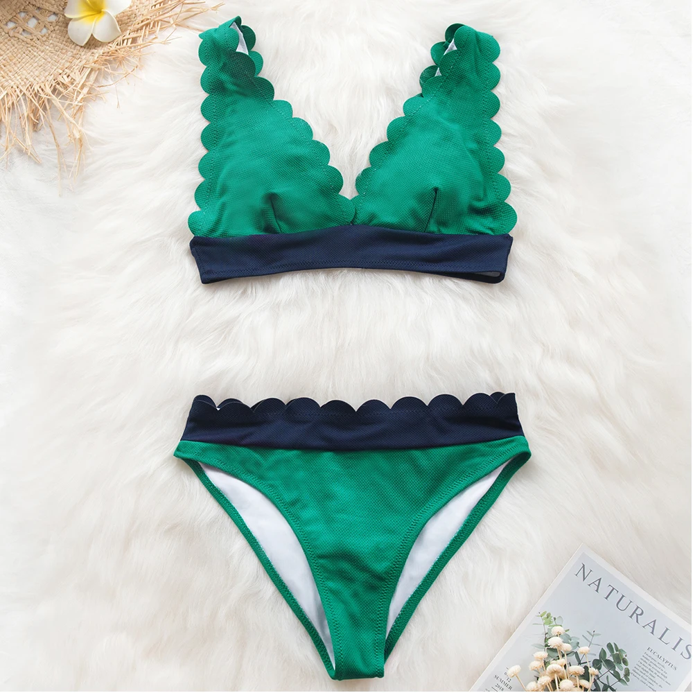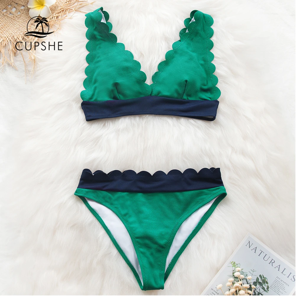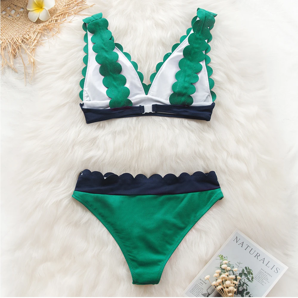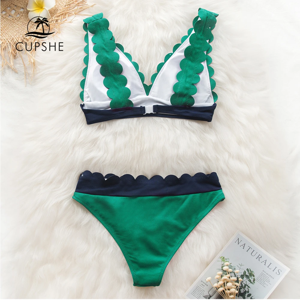 Морской день в этом зеленом и темно-синем зубчатом бикини. Этот элегантный комплект сочетается с топом бикини с v-образным вырезом и низом бикини с низкой посадкой, чтобы подчеркнуть ваши изгибы. Милая отделка с фестонами придает женственность цветному стилю, а застежка на крючок сзади гарантирует, что она будет держаться.