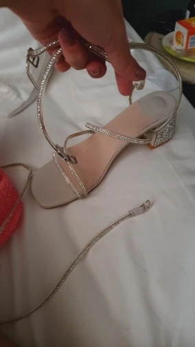 Они идеальны! У меня размер 35.5 и худая нога, 35 здесь полноразмерный, я на максимум затягиваю ремешки. Материал ремешков силикон и наклеенные стразы. Для праздничного образа идеальны, они так сверкают!