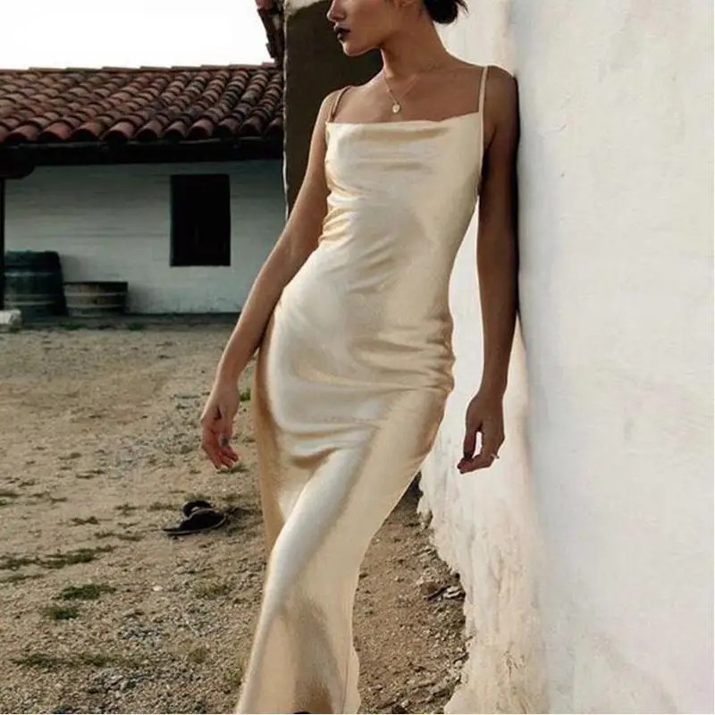 Платье миди атласное золотистое, пиканвечерние платье в стиле бохо, Элегантные повседневные винтажные платья на бретелях-спагетти, белого и черного цвета, лето 2021