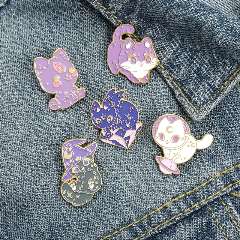 Женская эмалированная брошь в форме кота, фиолетовая брошь в форме Луны, кота, шляпы волшебника, дикой ведьмы, с кристаллами, космоса, с крылом, котенка, Волшебная бижутерия