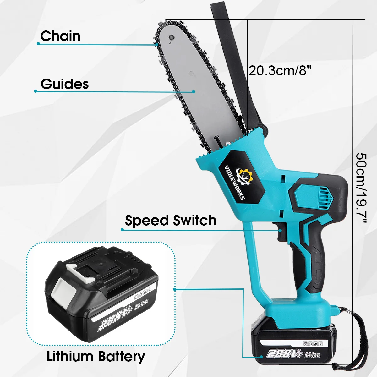 Пила цепная беспроводная, 288 в, с аккумуляторомПримечание: корпус также подходит для батареи Makita!Тип питания: технология перезаряжаемого литиевого аккумулятораЦвет: синийНоминальное напряжение: 288 вНоминальная входная мощность: 1500 Вт