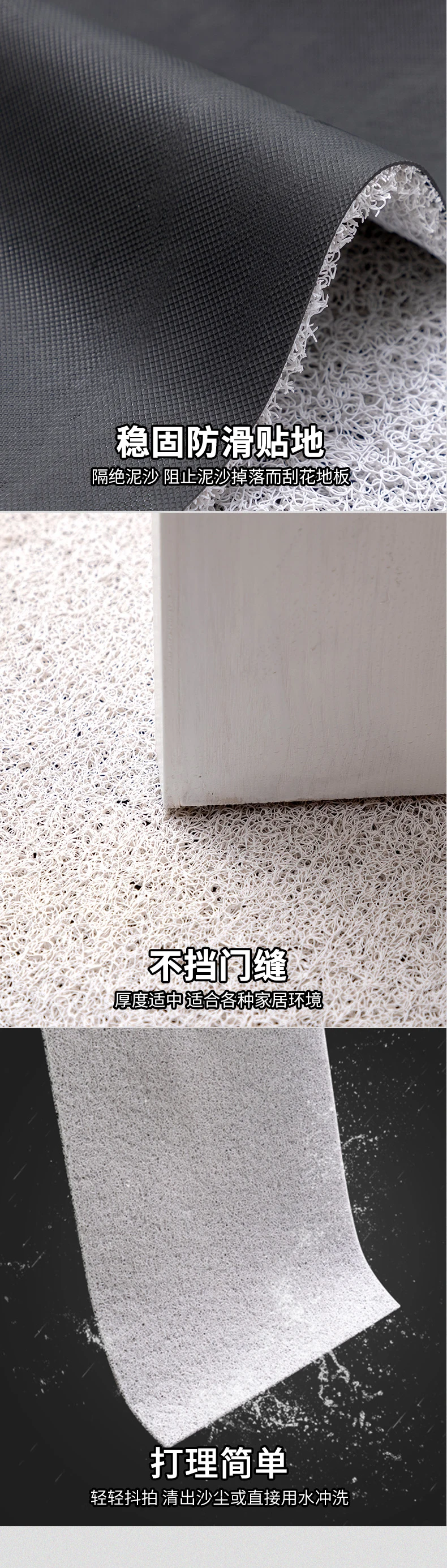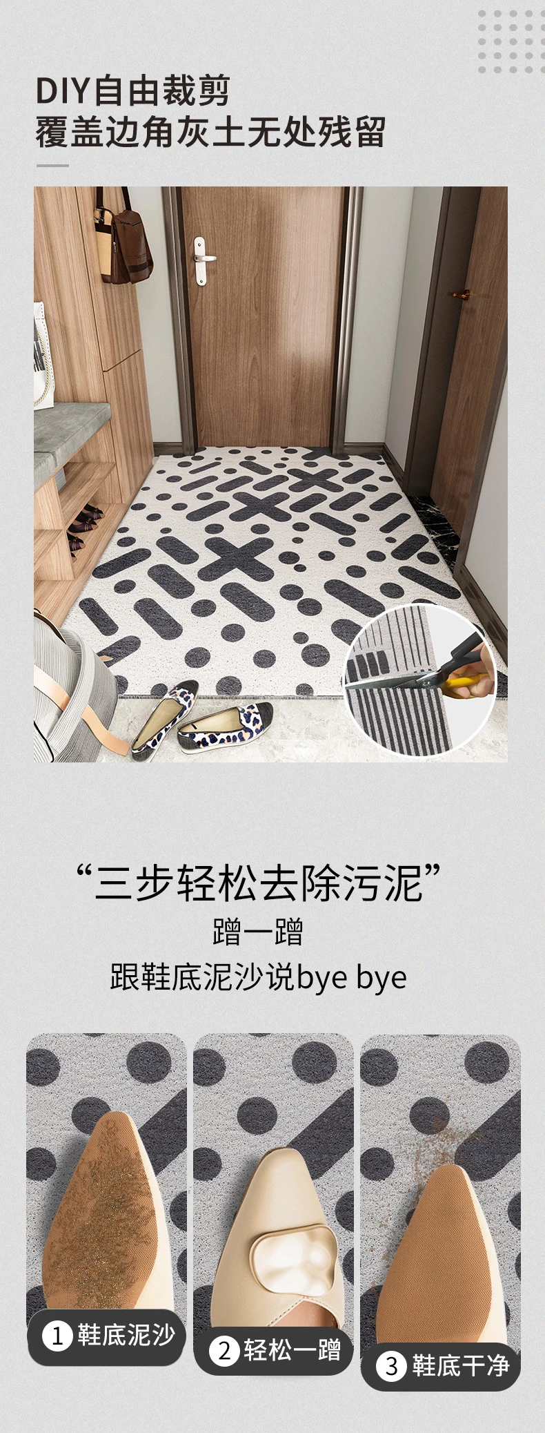 > Этот продукт может быть настроен в соответствии с размером входа, пожалуйста, свяжитесь с нами, если вам нужно настроить. > Он изготовлен из экологически чистого материала и безвреден для людей. > Подошва изготовлена из противоскользящего материала, чтобы предотвратить скольжение коврика и защитить вашу безопасность, верхний материал может поглощать влагу от обуви, чтобы сделать полы чистыми и сухими, также удалите пыль, грязь, снег и т. д. > Его можно свободно разрезать на любые формы, которые вы хотите, и он подходит для внутреннего и наружного входа, прихожей, гостиной, спальни, ванной комнаты и т. д. > Толщина составляет около 8 мм, он может полностью лежать на полу и не будет мешать открыванию и закрытию двери. > Когда он заполнен частицами грязи, вы можете просто очистить его с помощью пылесоса, или вы можете использовать садовый шланг в краску, а затем позволить ему полностью высохнуть на воздухе перед следующим использованием.