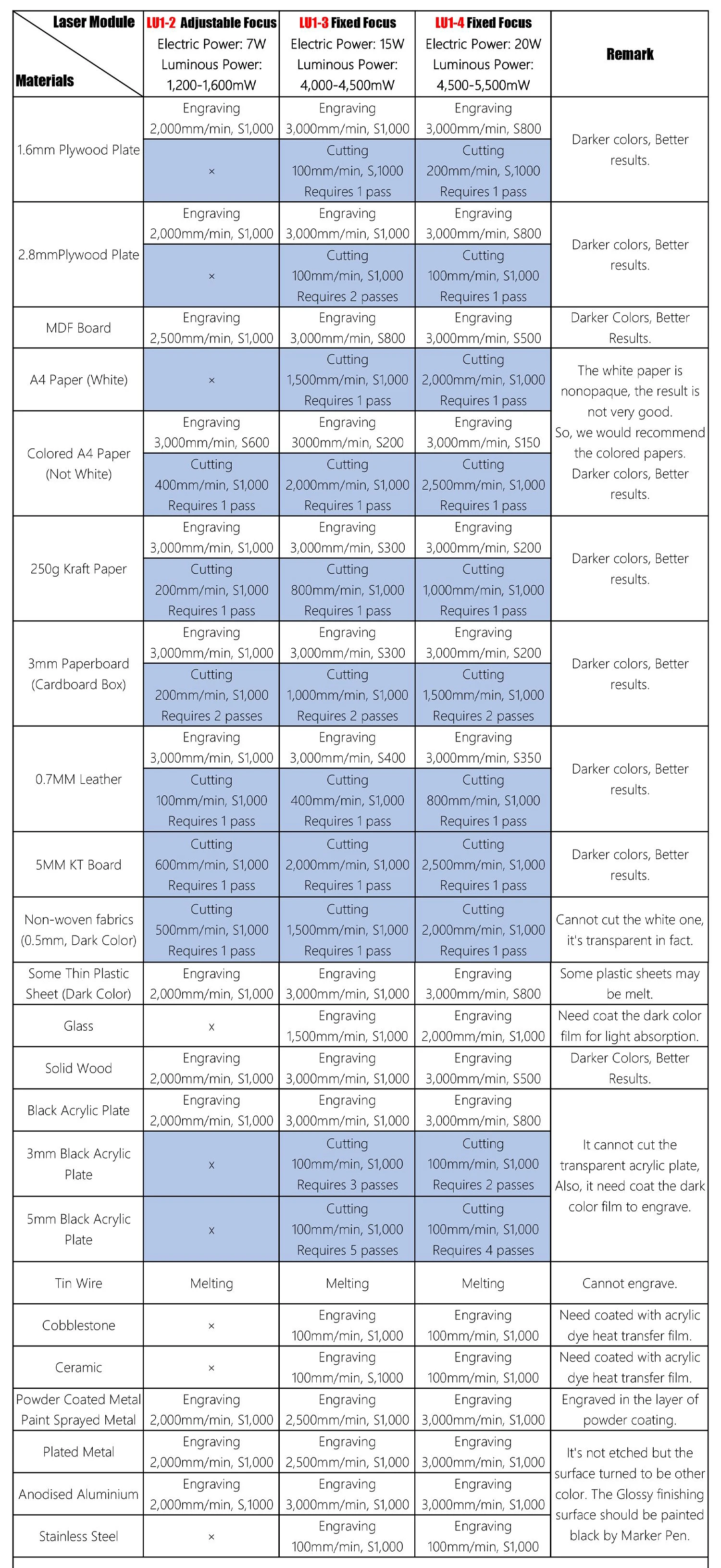 Available Laser ModulesLU1-2 7W, LU1-3 15W, LU1-4 20W
