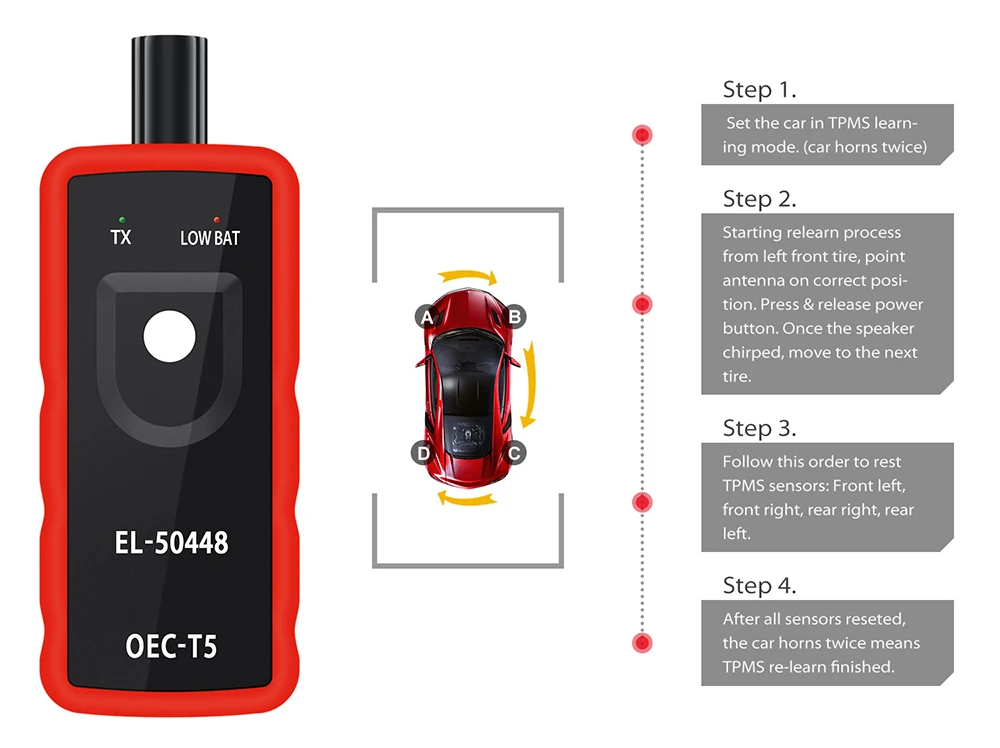 【Как использовать 】убедитесь, что ваш автомобиль находится в режиме обучения TPMS, удерживайте инструмент против боковой стенки шины, возле штока клапана. Нажмите кнопку learn, удерживая инструмент против боковины шины, пока рог не запотевает один раз.【ESSENTIAL TRIANING TOOL】 EL-50448 OEC-T5 является основным инструментом замены датчика давления в шинах, сигнализация давления в шинах удаляет или заменяет шины. Идеально подходит для контроля давления в шинах, тренировочных датчиков ваших автомобилей, поэтому предупреждающий светильник TPMS не будет освещаться.