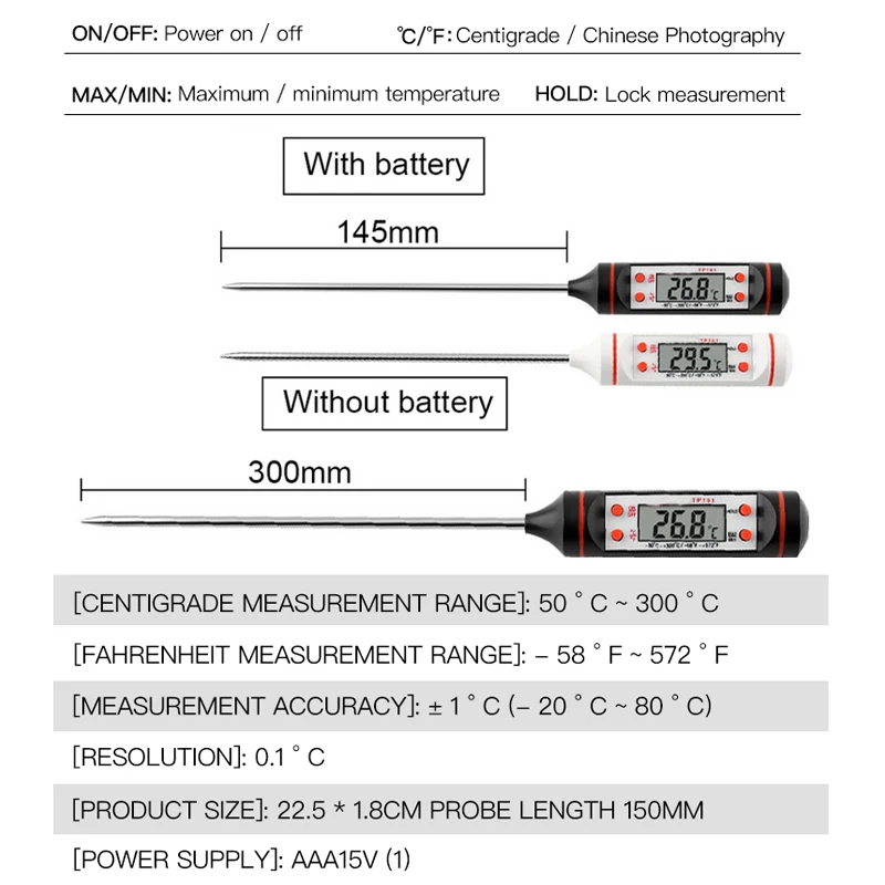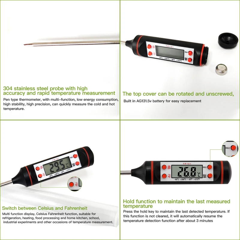 Модель: TP101 электронный цифровой термометр для едыЗонд изготовлен из нержавеющей сталиВес: 0,039 кгСписок продуктов: термометр, руководствоДиапазон измерения: температура воды, еда, жидкость, паста, температура масла, температура молока, чай, суп, пиво и так далееДиапазон измерения температуры: от-50 ° C до 300 ° C (от-58 ° F до + 572 ° F) Широкий диапазон измеренийОсобенности:Конструкция ручки, Зонд из нержавеющей стали, Прямое измерение, легко носить с собой.Описание функции кнопки: 1, ВКЛ./ВЫКЛ.: функция переключения2, C / F: преобразование Цельсия/Фаренгейта3, удерживание: функция блокировки температуры, Нажмите эту кнопку, затем температура заблокирована, а затем нажмите функцию блокировки, чтобы поднять.4, Макс/мин: высокая температура и память низкой температуры, Нажмите эту кнопку, чтобы отобразить предыдущую высокую температуру, затем нажмите предыдущий дисплей низкой температуры, а затем восстановите состояние измерения температуры.Технические данные:Разрешение: 0,1 °Точность: ± 1 ° (-20 ° ~ + 80 °) ± 2 ° (другой диапазон)Режим энергосбережения: 10 минут функция автоматического отключенияИсточник питания: AG13 кнопка батареи 1 (не включая)Пожалуйста, укажите свой выбор цвета, если нет, мы вышлем цвет случайным образом (черный и белый)