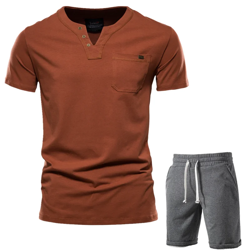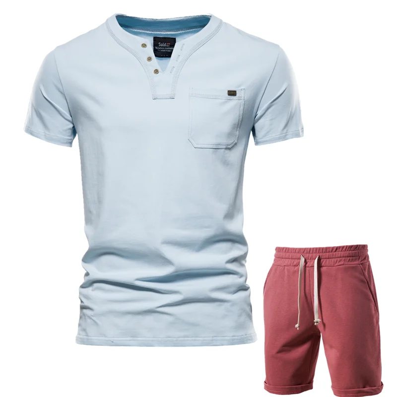 Комплект мужской AIOPESON из футболки и шорт, повседневный однотонный комплект из двух предметов, мужская одежда с V-образным вырезом и коротким рукавом, на лето