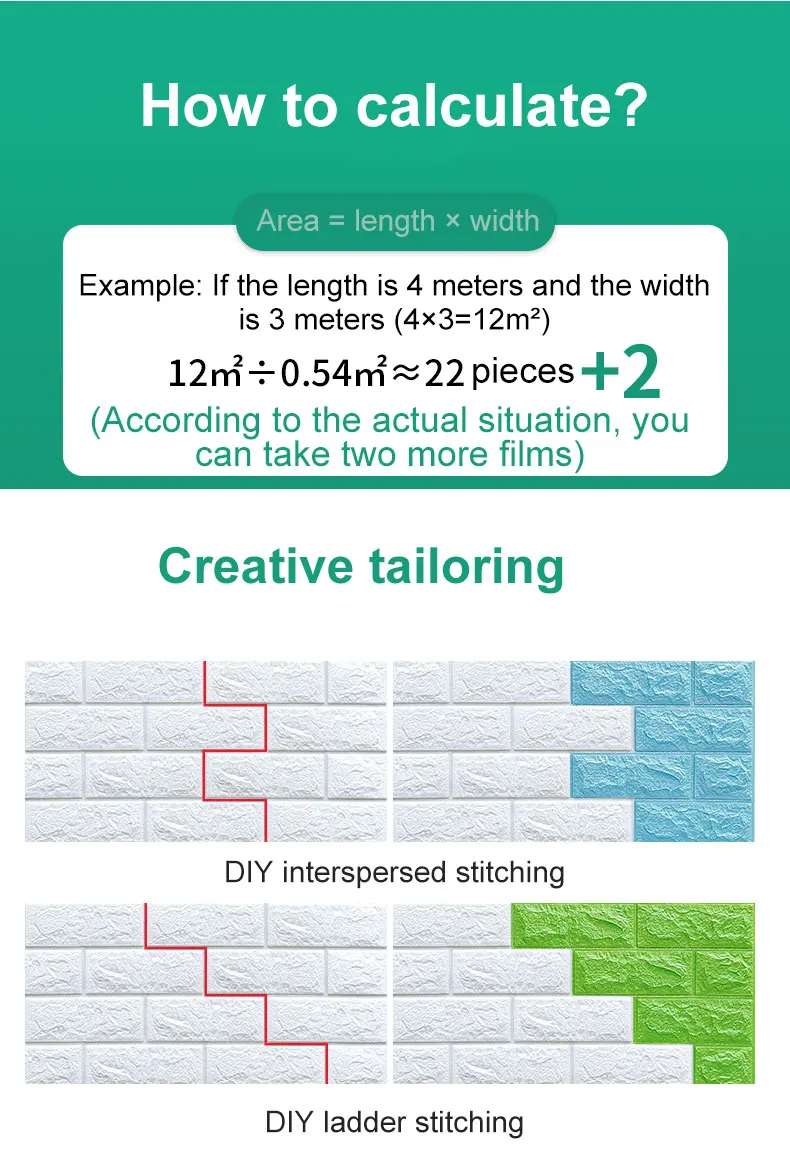В: что происходит, когда вы покупаете 1 стикер на стену?О: одна Наклейка на стену, как огромный кусок белой бумаги, легко ломается во время транспортировки. При покупке одного образца, пожалуйста, не обращайте внимания на ее повреждение.В: какой размер наклейки на стену?О: пожалуйста, посмотрите размер наклейки на стену перед размещением заказа.60*30 см = 0,18 ㎡ = 279кв. В 60*60 см = 0,36 ㎡ = 558кв. В70*15 см = 0,10 ㎡ = 162кв. В 70*38,5 см = 0,27 ㎡ = 417кв. В 70*77 см = 0,54 ㎡ = 835кв. ВВ: почему настенные наклейки отличаются по цвету?О: поскольку цвет каждой партии настенных наклеек будет повторно тонироваться, цвет различных партий настенных наклеек будет отличаться. Поэтому, пожалуйста, купите достаточное количество настенных наклеек, чтобы избежать хроматических аберраций.В: почему размер наклейки на стену имеет погрешность?О: Поскольку размер наклейки на стену вырезается вручную, возможна погрешность в 1-2 см.В: почему моя Наклейка на стену отваливается?О: поверхность должна быть чистой и аккуратной, с адгезией, такой как: деревянная доска, стеклянная поверхность, стена без пыли, стена с шпатлевым дном и т. д. В противном случае стикер на стену будет легко падать.В: каков материал настенной наклейки?A: наклейка на стену изготовлена из пеноматериала, который не вызывает столкновений, не загрязняет окружающую среду, не вызывает специфического запаха.-